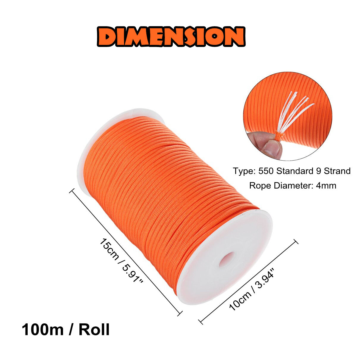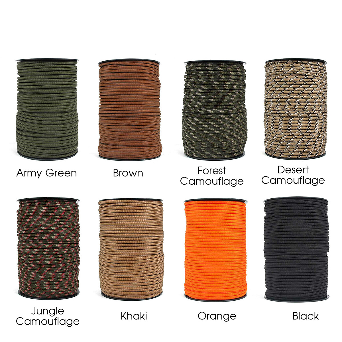 Specifications: Material: Polypropylene & Polyester Strand Quantity: 9pcs Diameter: Approx. 4mm/0.15 inch Total Length: Approx. 100M/328 feet Color: Black, Army Green, Khaki, Orange,Desert Camouflage,Forest Camouflage,Brown,Jungle Camouflage(optional) Net Weight: Approx. 550g Packing List: 1 x Paracord Roll(100M)