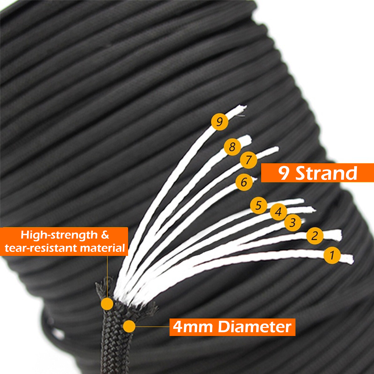 * PREMIUM MATERIAL: This paracord with 9 strand cores is made of Polypropylene and Polyester and is wear resistant and lint-free.