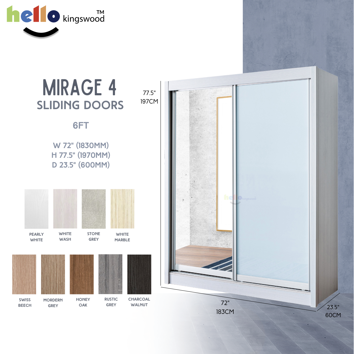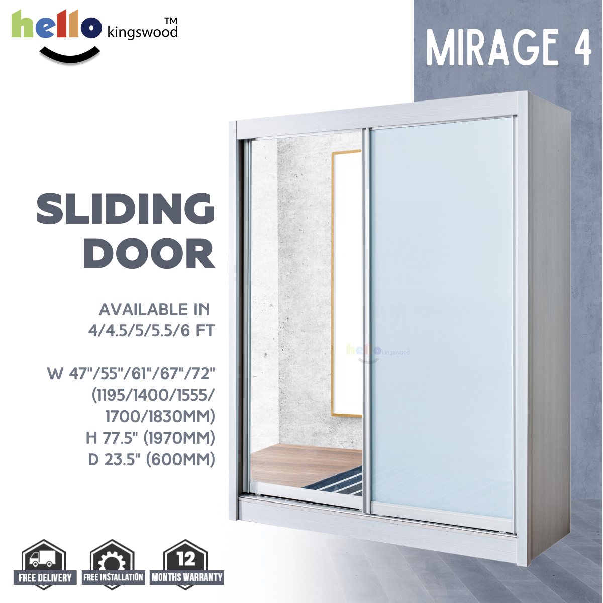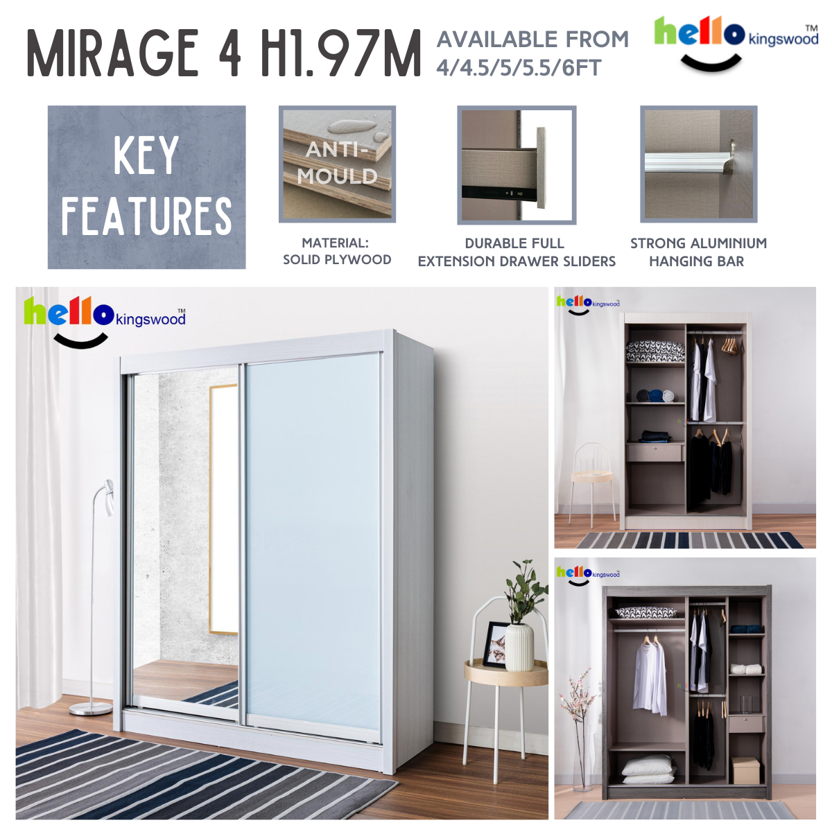 12 months manufacturer warranty included Material: Solid Plywood Sturdy aluminium door frame Strong aluminium hanging bar Durable full extension drawer slides Width: 4, 4.5, 5, 5.5, 6ft Dimensions: H77.5" X D23.5" Frame Colour: Available in 9 trendy colours Mirage 4 Door Design: Full Mirror + Metallic White (Glass) Please PM us if you are looking for height 2.4m sliding wardrobes.