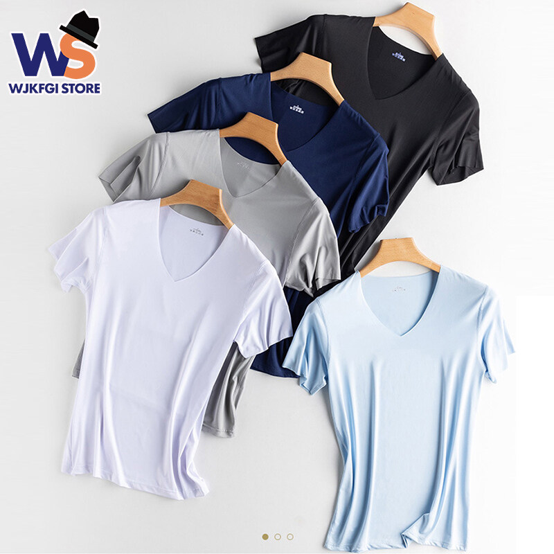 KYUSHUAD Ice Silk Seamless Short Sleeve T-shirt for Men V-neck Summer Thin Elastic Fit Top Mesh Quick Drying
