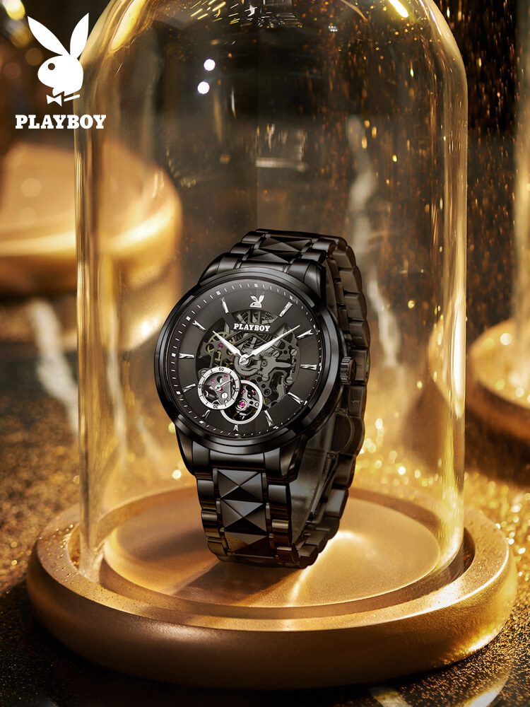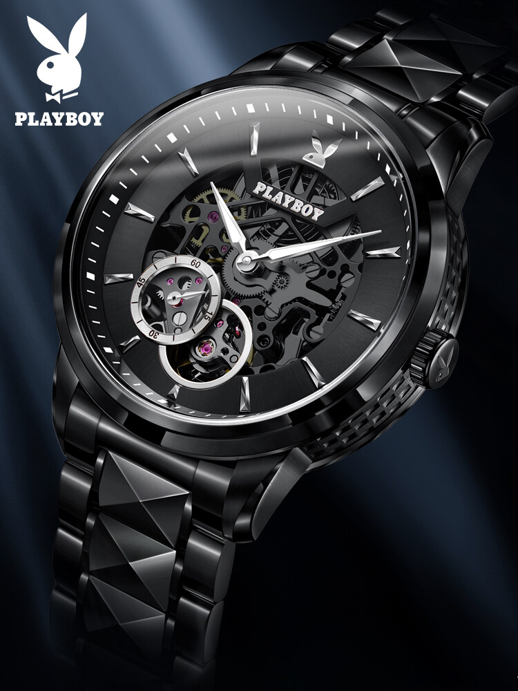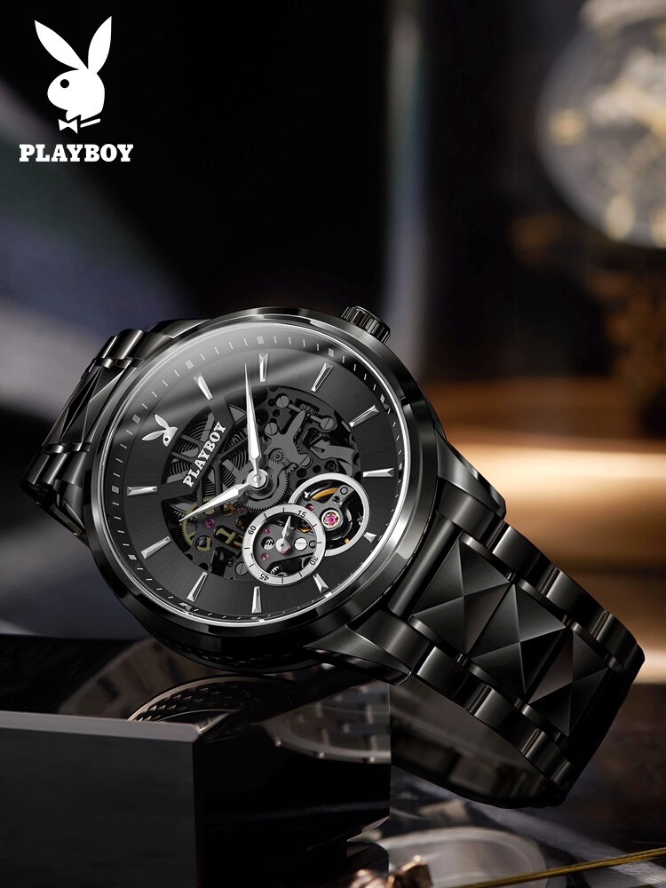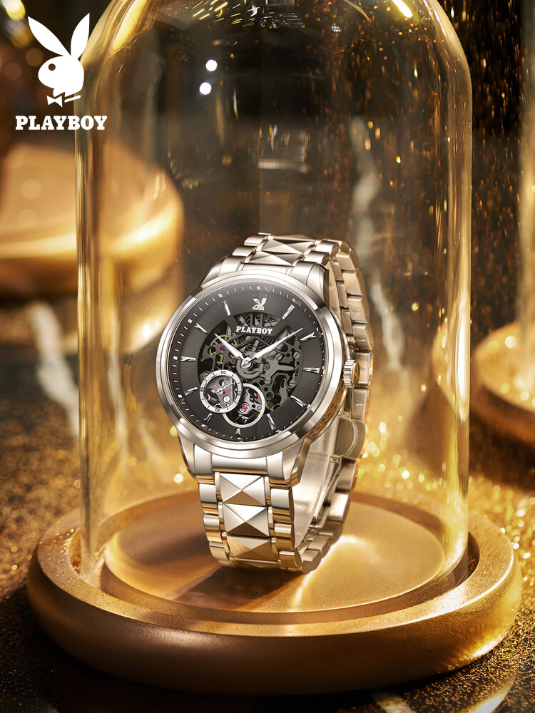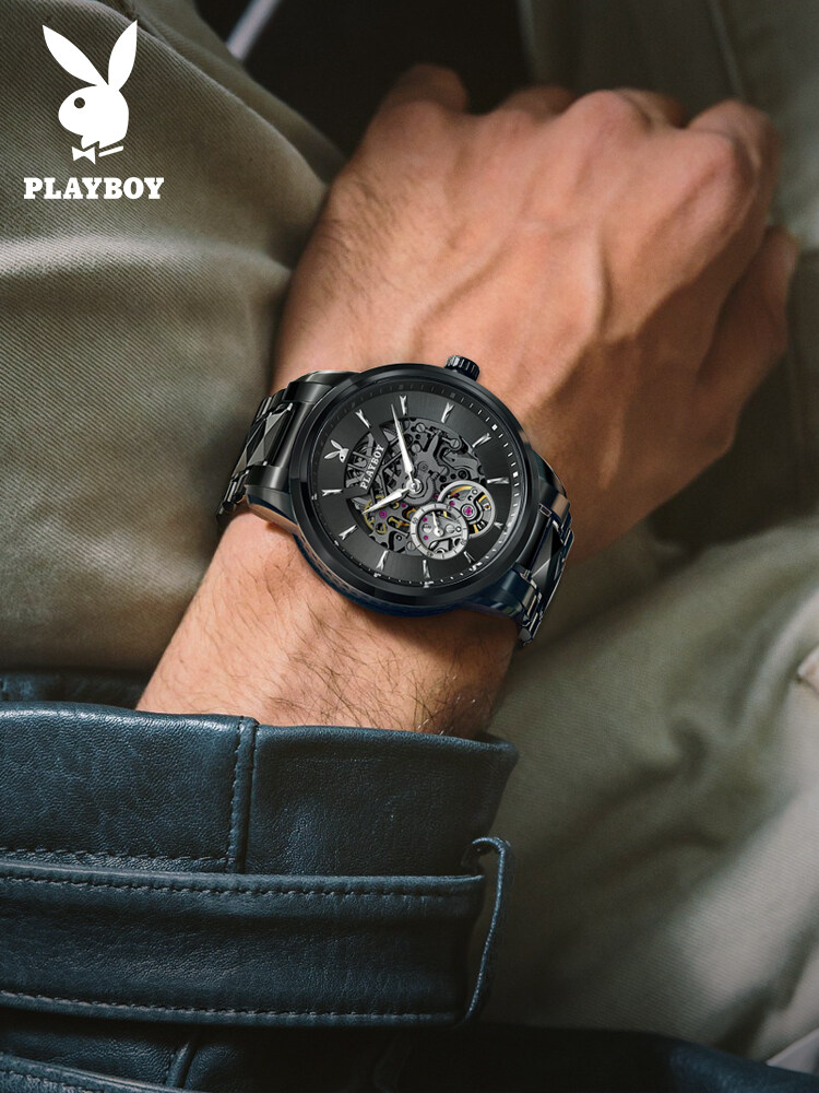 PLAYBOY Luxury Movement Automatic Mechanical Watch For Men 2021 New USA Double-sided Perspective Stainless Steel Strap Watch Waterproof Luminous Display