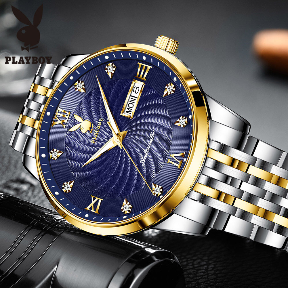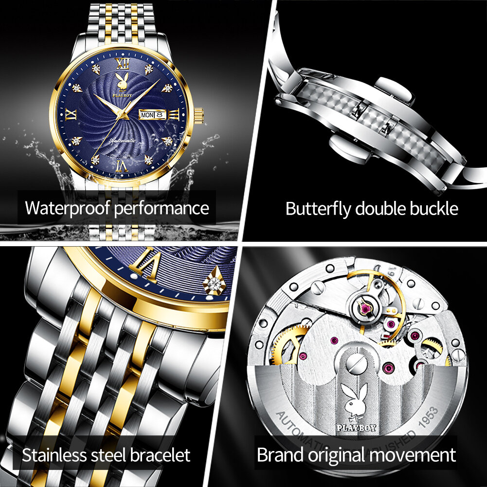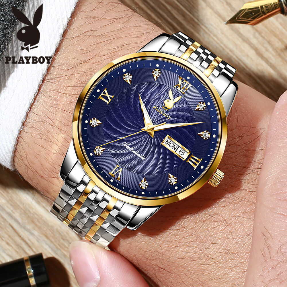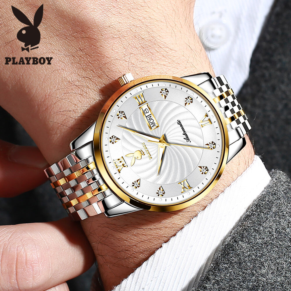 PLAYBOY Thin Automatic Mechanical watches For Men 2021 Sale Waterproof Casual Stainless Steel Atmosphere Watch Luminous Dual Calendar Display