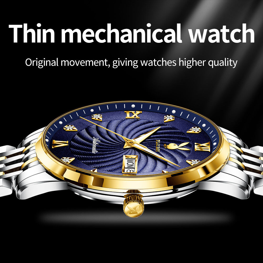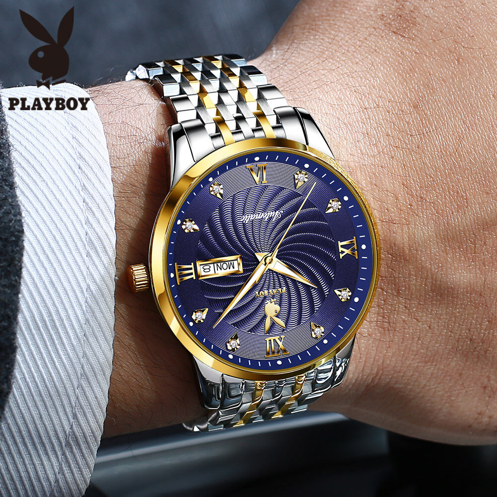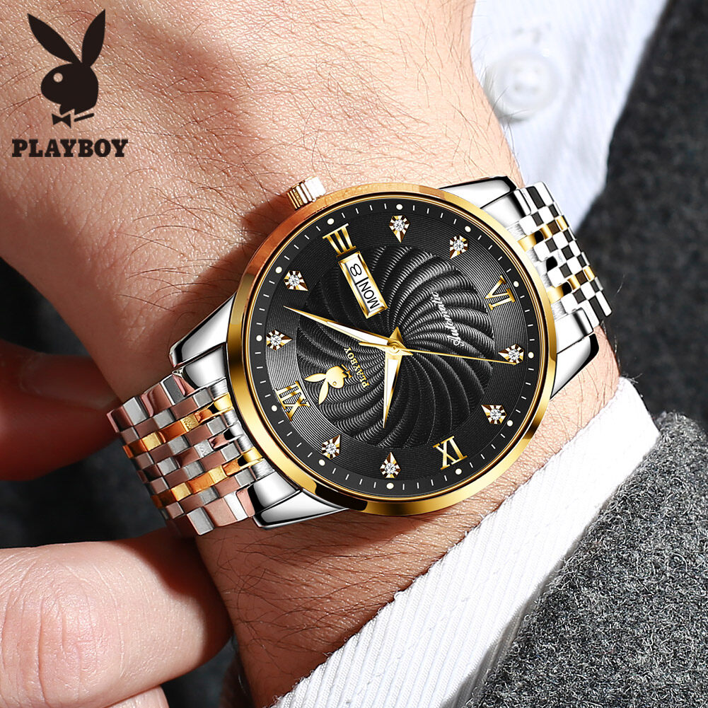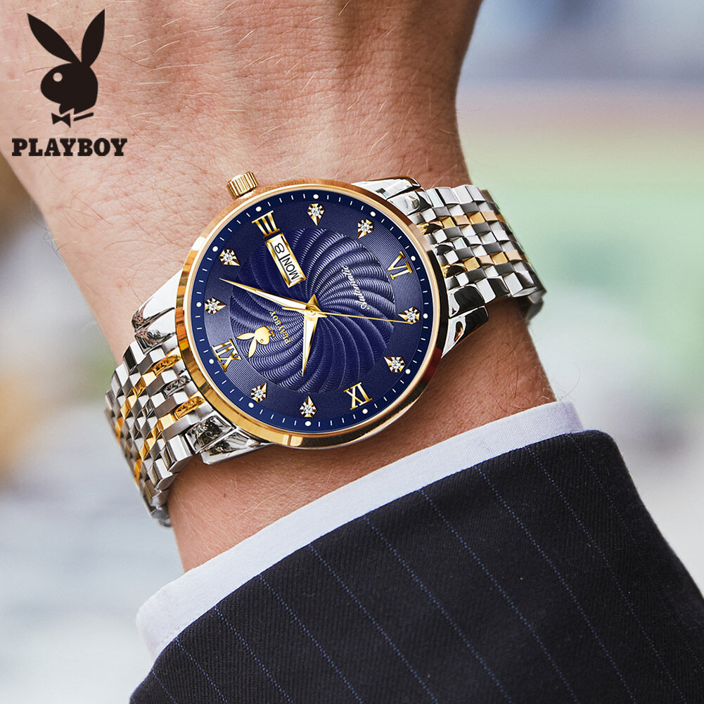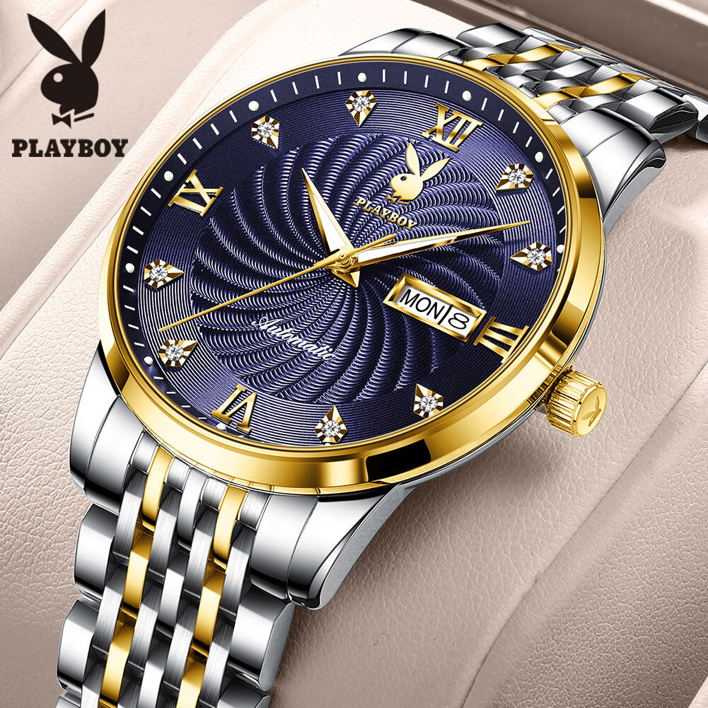 PLAYBOY Thin Automatic Mechanical watches For Men 2021 Sale Waterproof Casual Stainless Steel Atmosphere Watch Luminous Dual Calendar Display