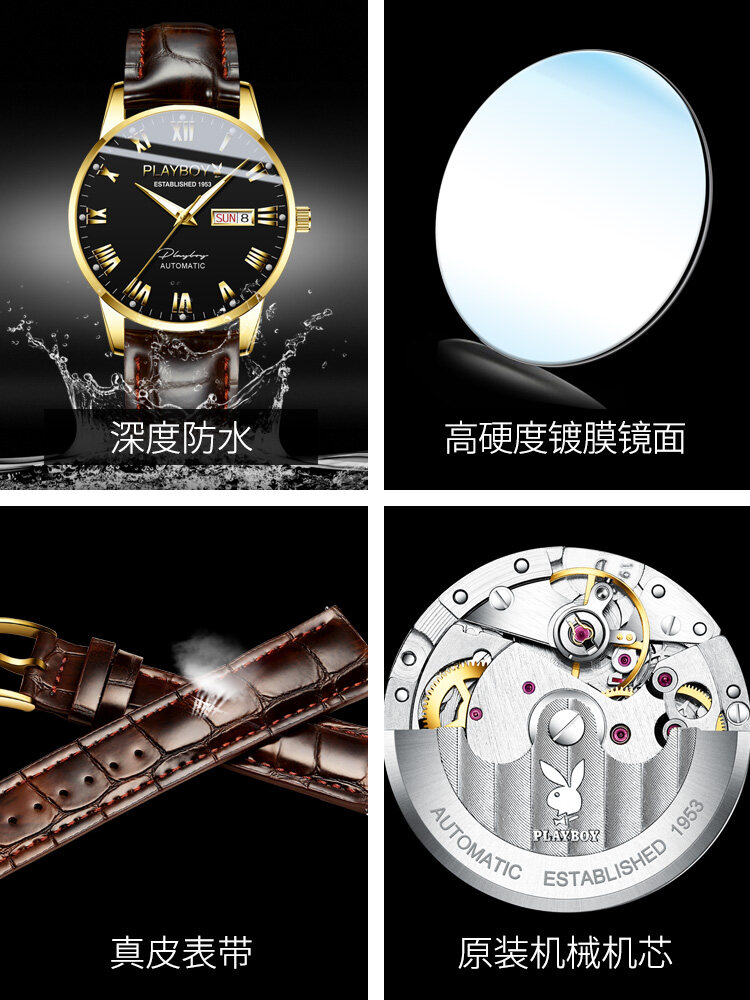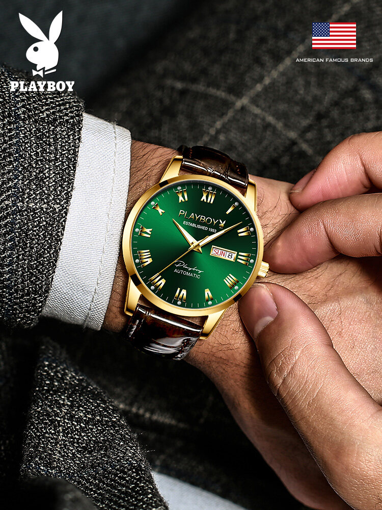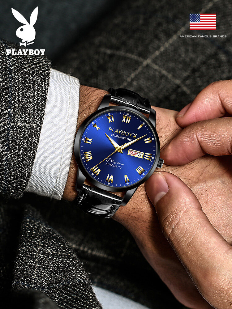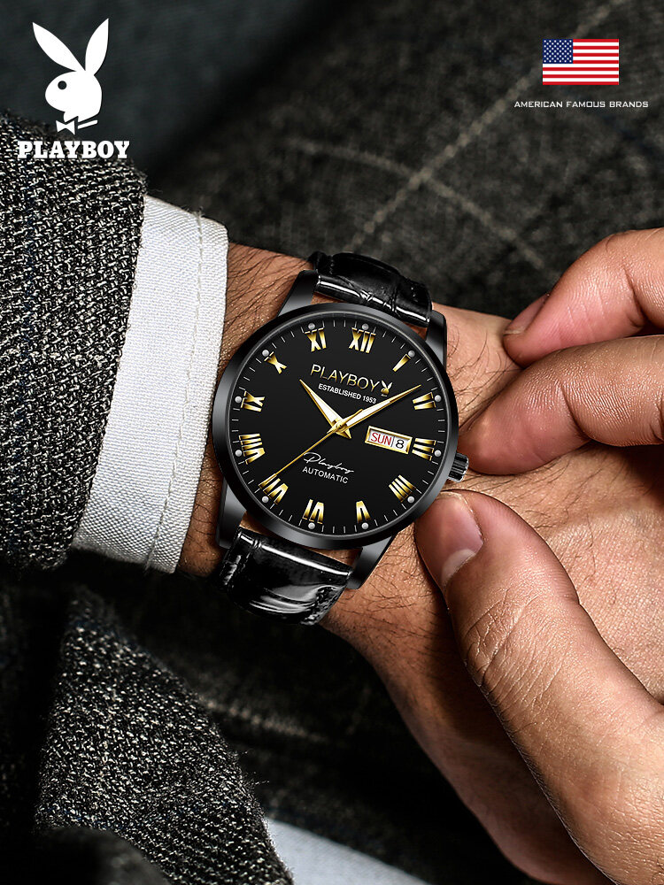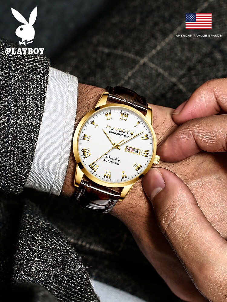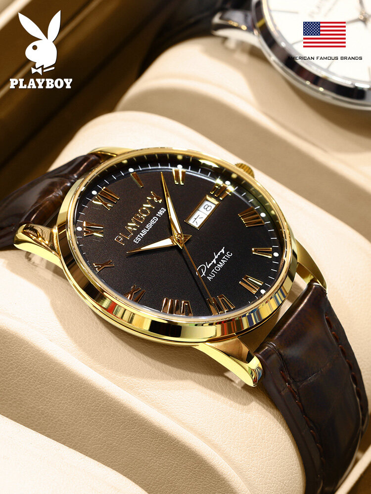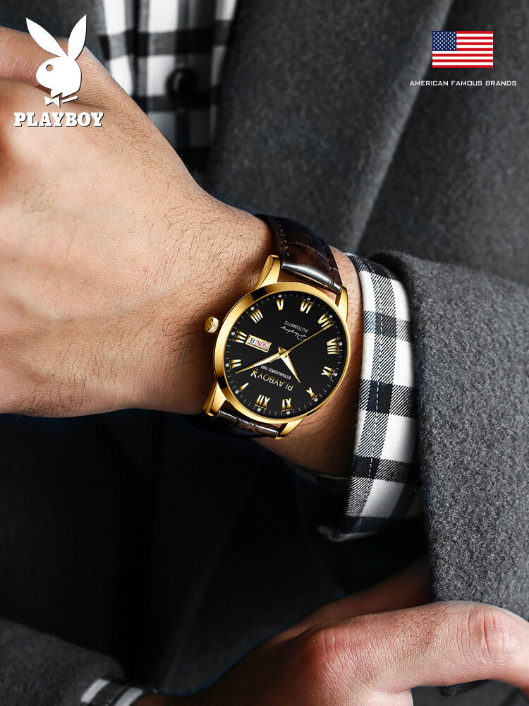 PLAYBOY Gentleman Watch For Men Automatic Mechanical American Brand Swiss Certified Movement Fashion Leather Strap Waterproof Dual Calendar Display