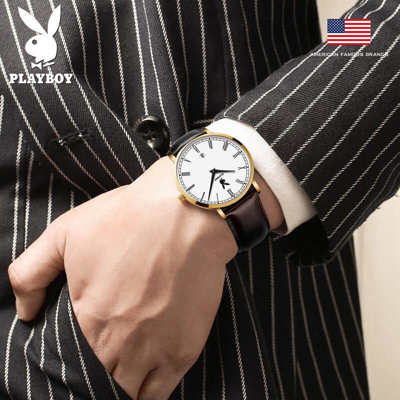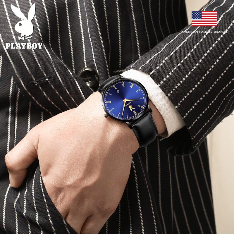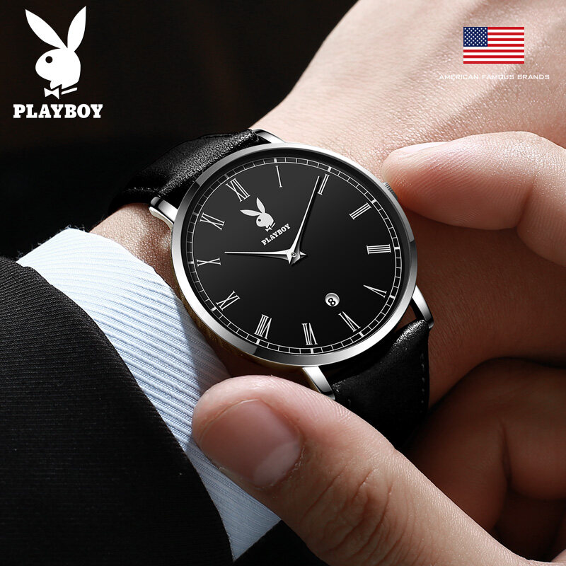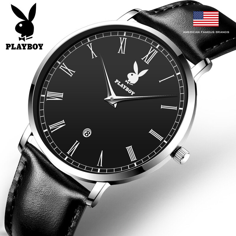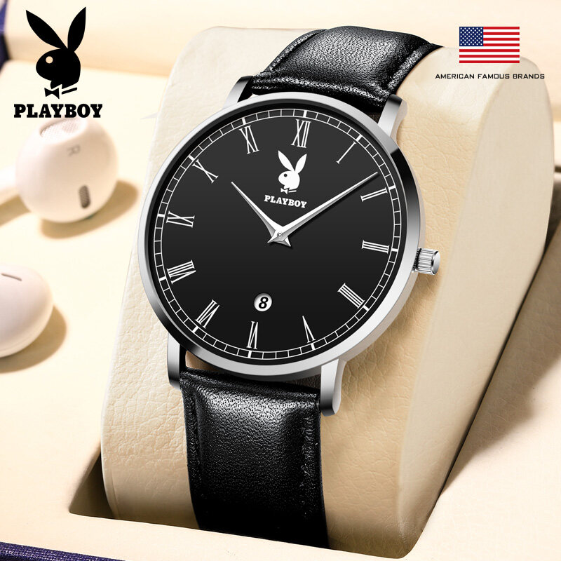 PLAYBOY Simple Quartz Watch For Man Original Waterproof Hot Selling Casual Leather Strap Watch Date Display Free Box