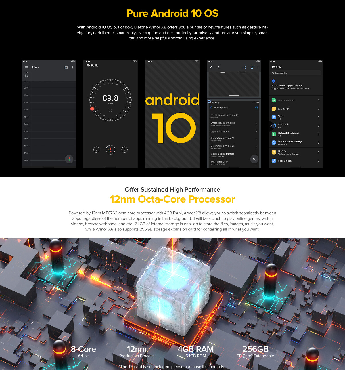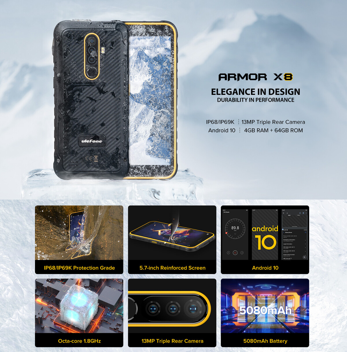 (Official shop)Ulefone Armor X8 IP68 IP69K Waterproof 5.7 inch 4GB 64GB 13MP Triple Rear Camera NFC 5080mAh MT6762 Octa Core 4G Rugged Smartphone
