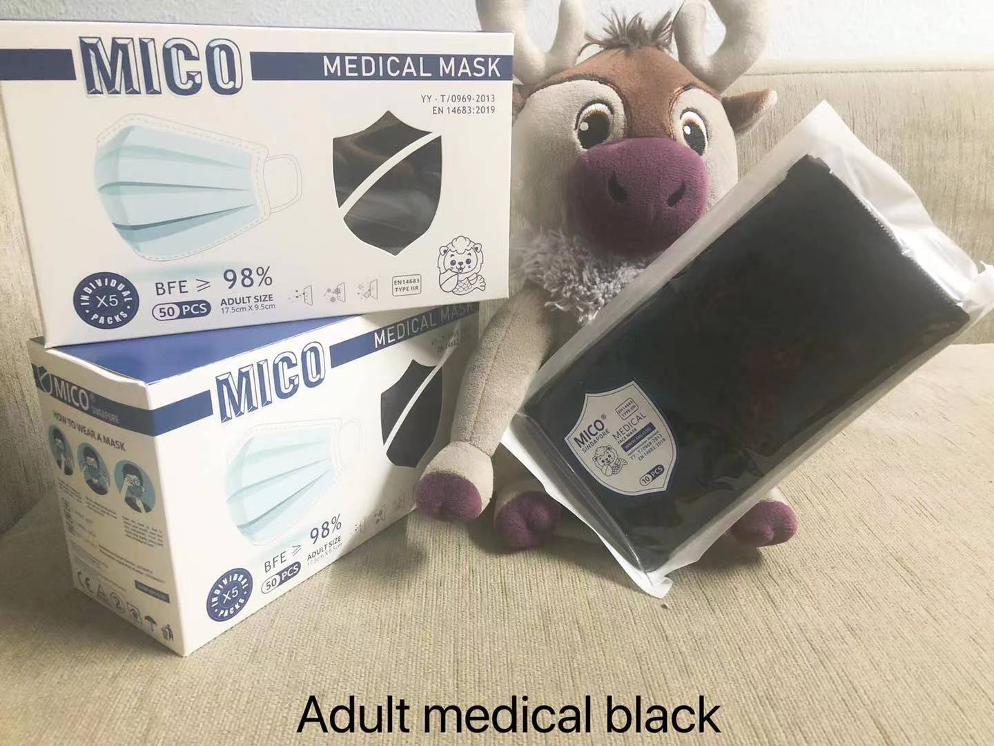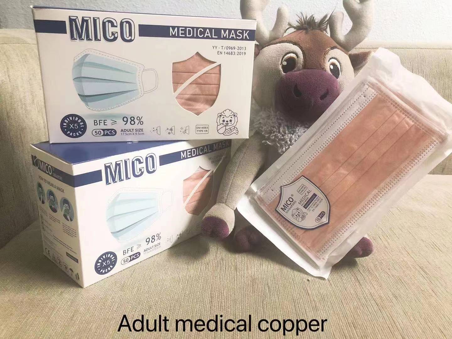 - Efficient protective meltblown cloth - Comfortable non woven fabric - Ultrasonic seamless technology - Strong plasticity nose strip - With MICO stamp on mask to provide authentication - This product complies with t He BFE and PFE standards specified by YY/T 0696-2013 Surgical mask