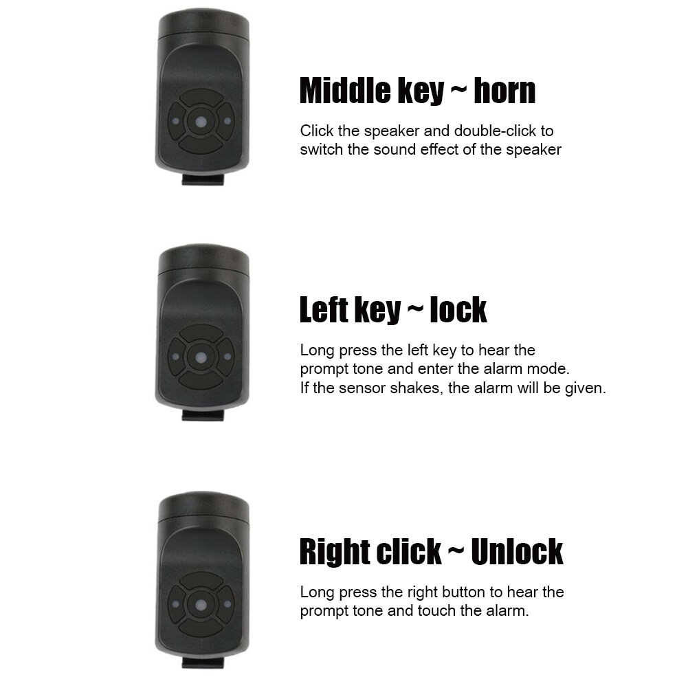 1. Anti theft alarm function: in alarm mode, it will alarm when vibration is sensed, and the loud sound will deter thieves. Long press the left button to turn on the alarm, and long press the right button to turn off the alarm.