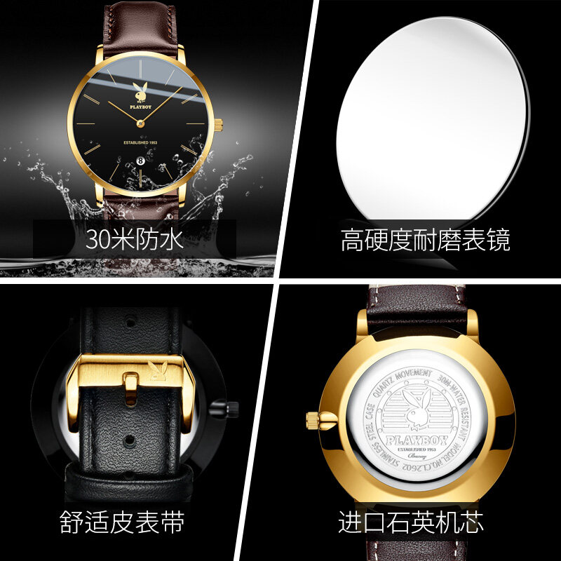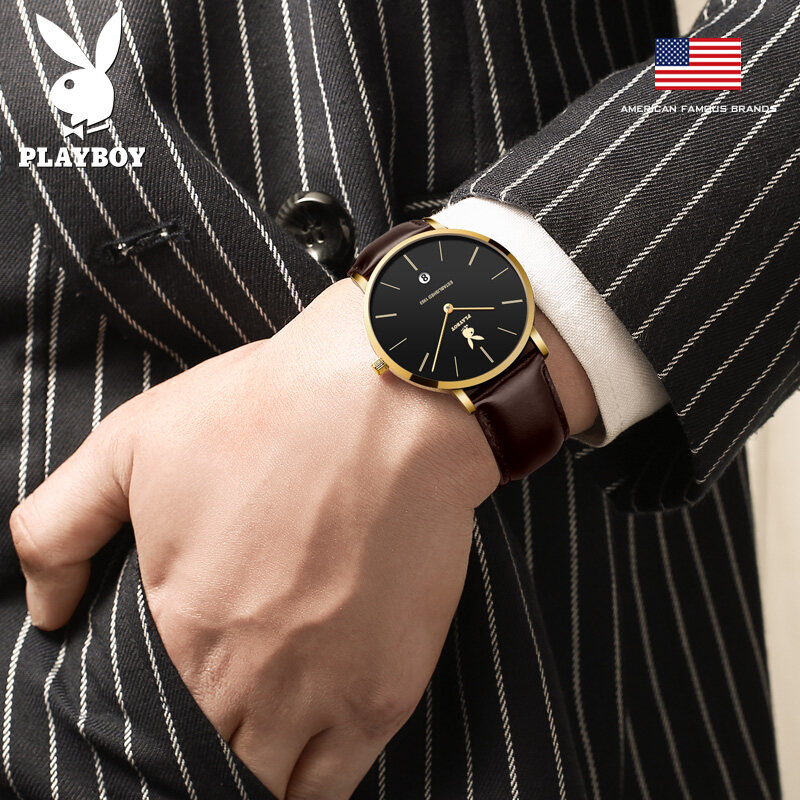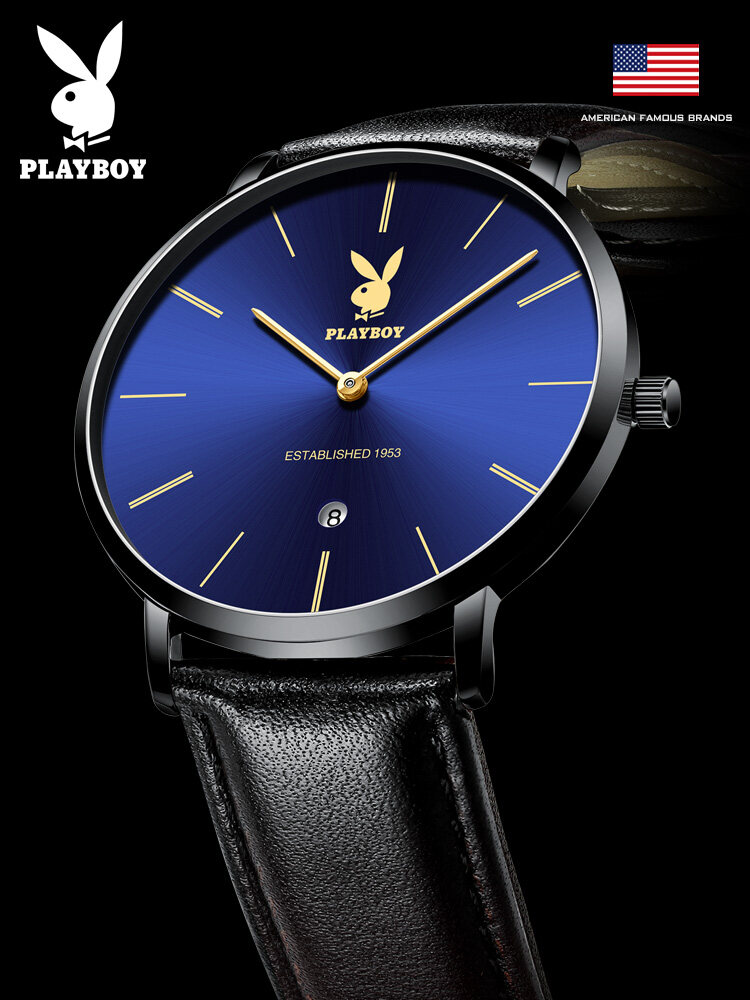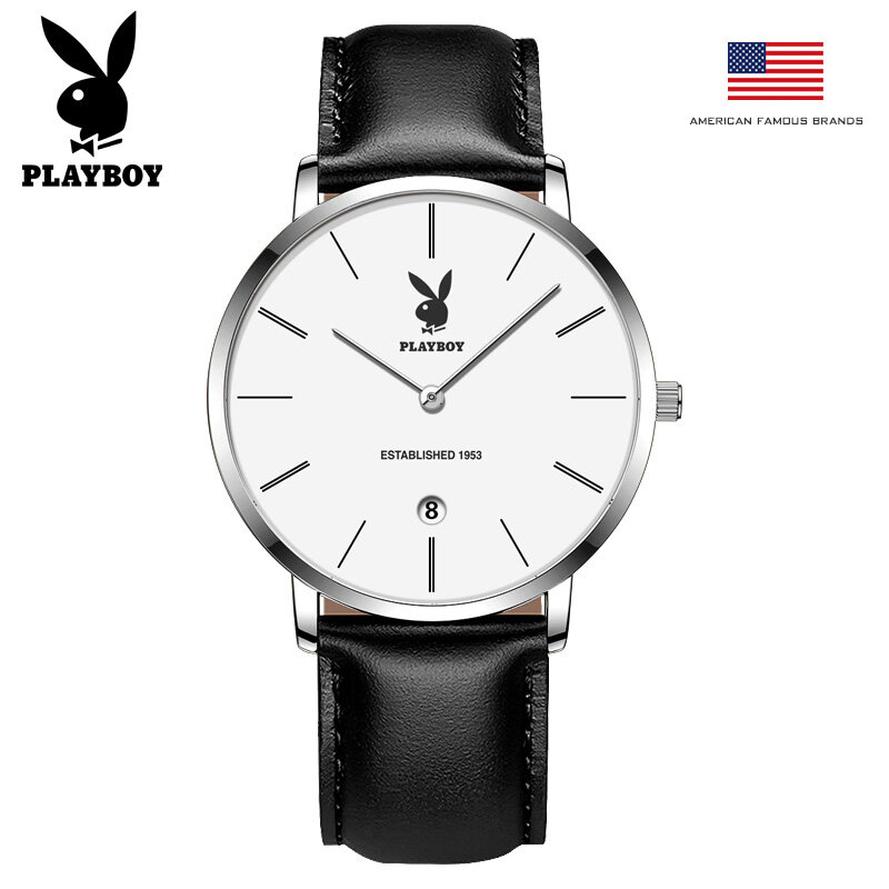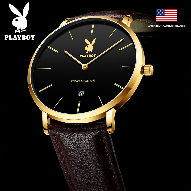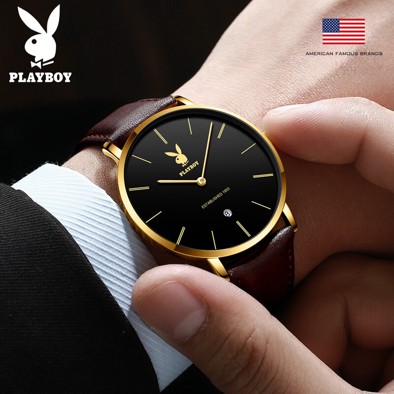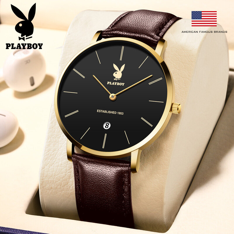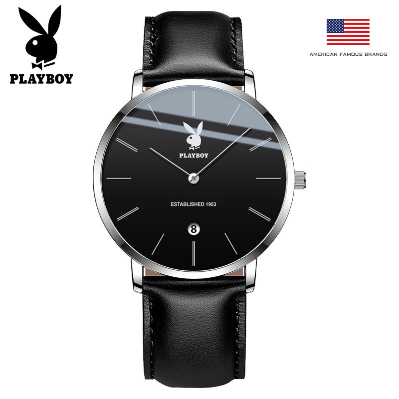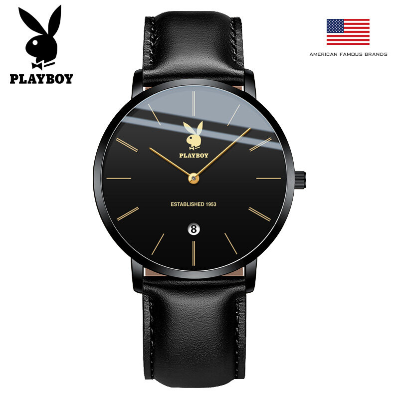 Imported original PLAYBOY men's watch, genuine leather strap,two-hand calendar quartz casual watch
