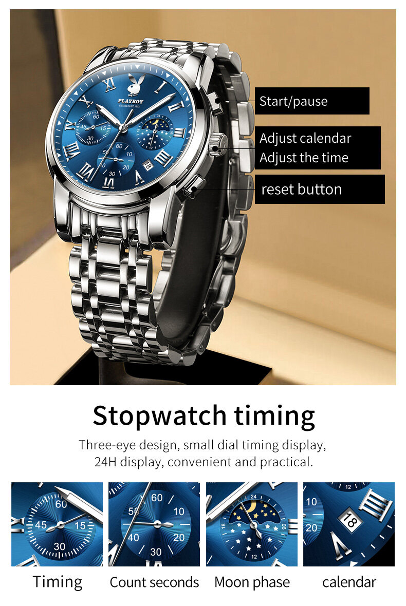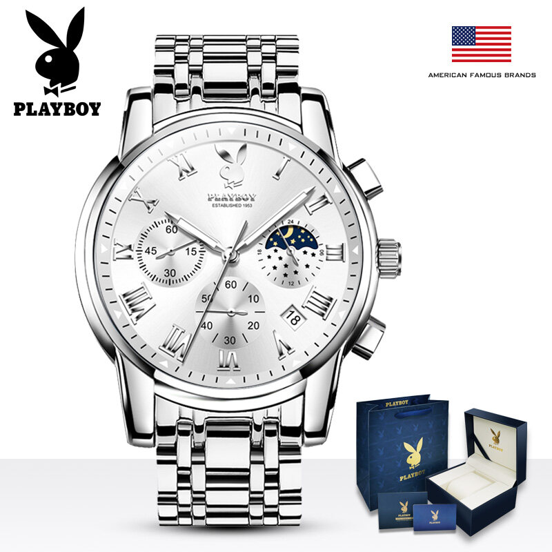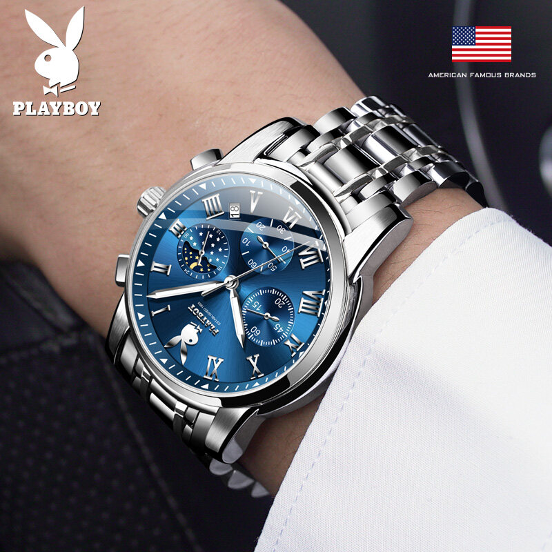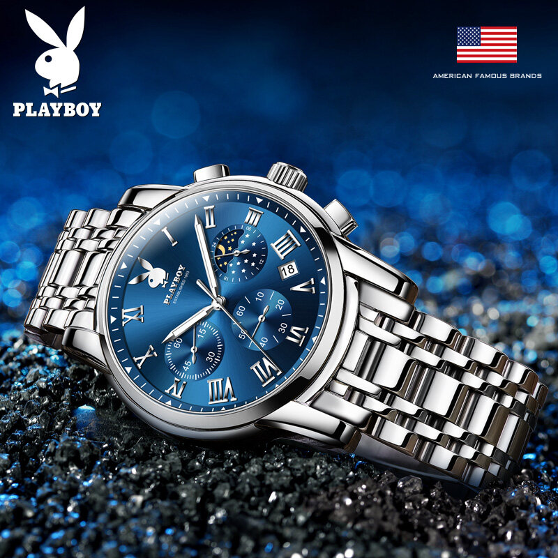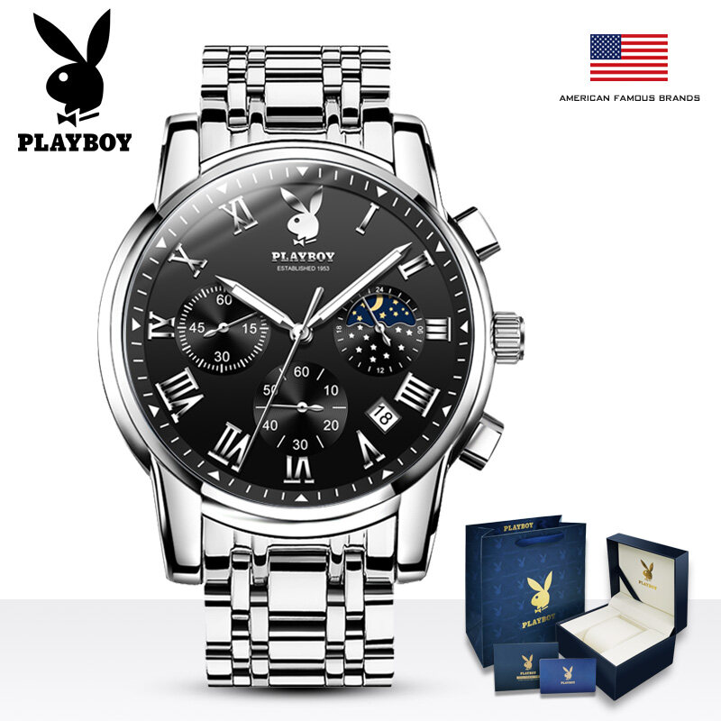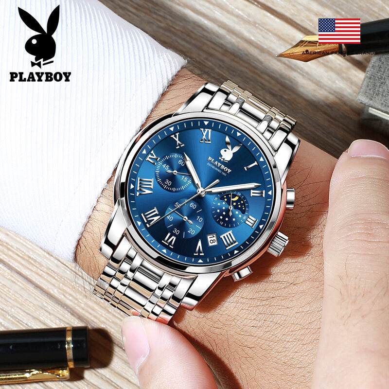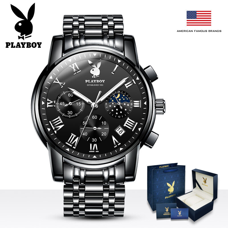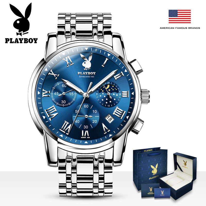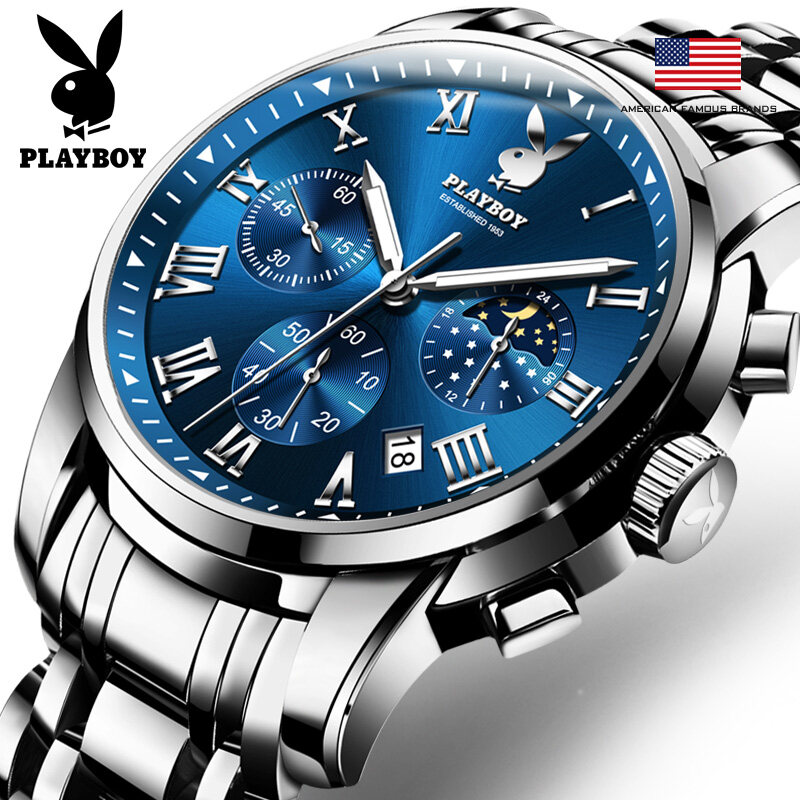 PLAYBOY Authentic Watch for men original imported solid Stainless Steel Luxury Luminous Calendar Chronograph Quartz Watch Black Blue