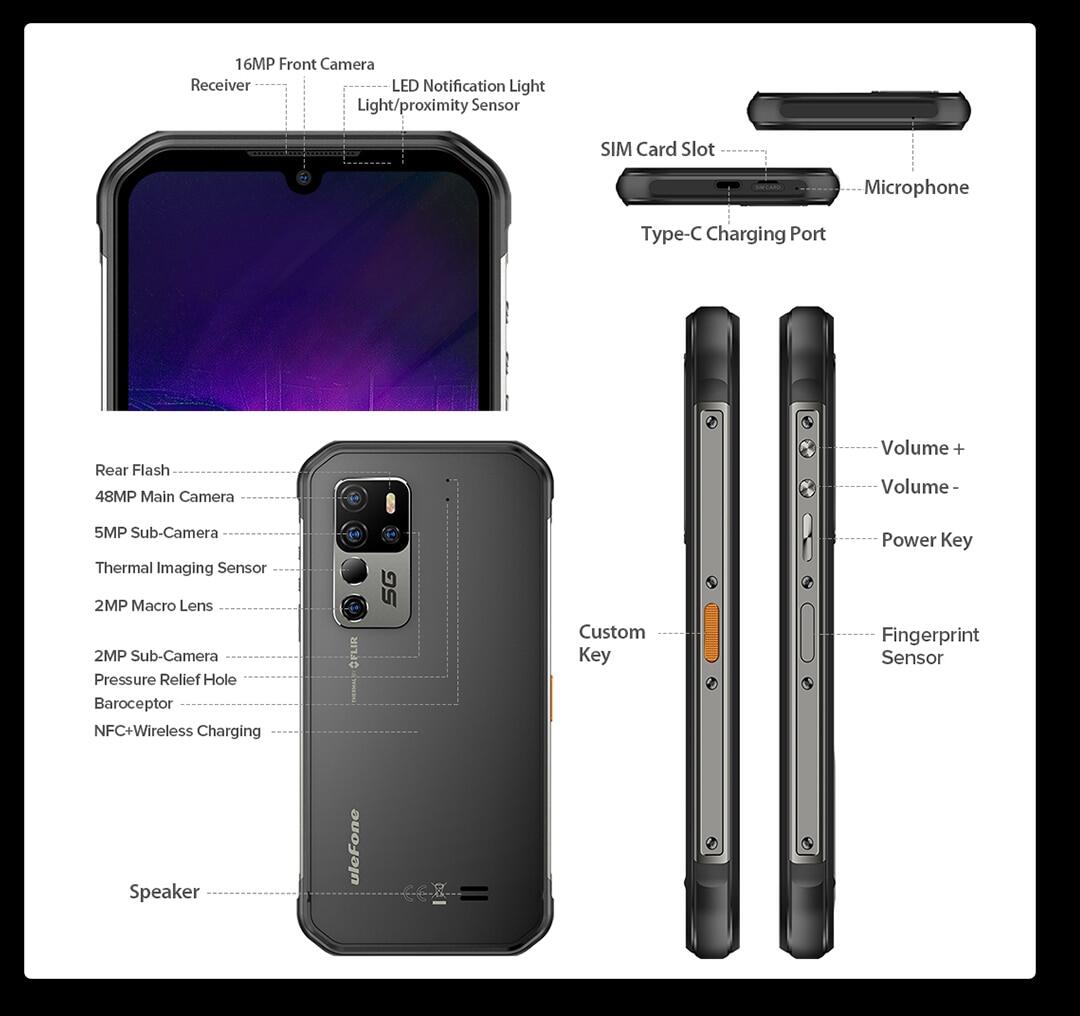 Features 1. MTK MT6873 Dimensity 800 octa core 2.0GHz CPU, good performance, run fast and operate smoothly. 2. 6.1 inch 1560 x 720 pixel, high clear, vivid colors, good for watching video, playing games. 3. 360 degree all round protection, it is rugged and durable to use. 4. IP68/IP69K level waterproof dustproof shockproof, it can be used in wide usage scenarios and applications. 5. Powered by 5200mAh high capacity battery, long life to use. 6. 48MP (FOV 79 degree, F/1.79)+5MP(FOV 76 degree, F/2.2, secondary camera for the FLIR thermal imaging function)+2MP macro lens(FOV 79 degree, F/2.4) + 2MP sub-camera 4 rear cameras, capture wonderful moments, take sharp and clear pictures.