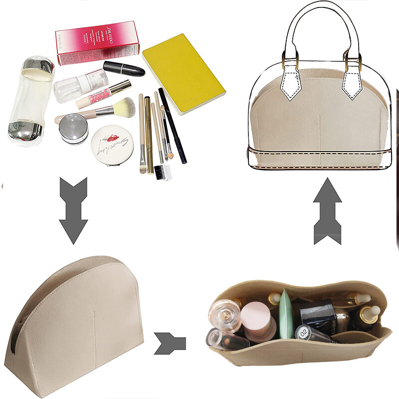 Felt Bag Organizer: Material:Made of premium Felt fabric. It is very Sturdy and light,protection. Size Guide: BB: 21 x 10 x 14 cm S: 30 x 14 x 22cm M: 34 x 15 x 25cm Note:If not for this series of products, you can choose the closest but not exceeding size!