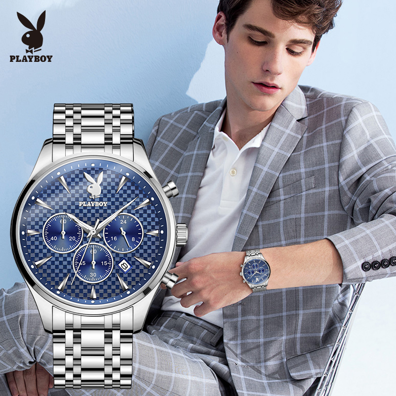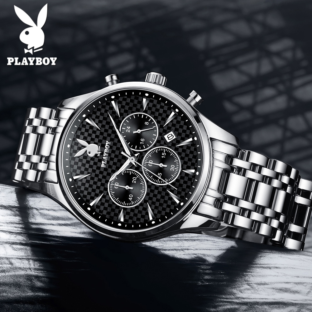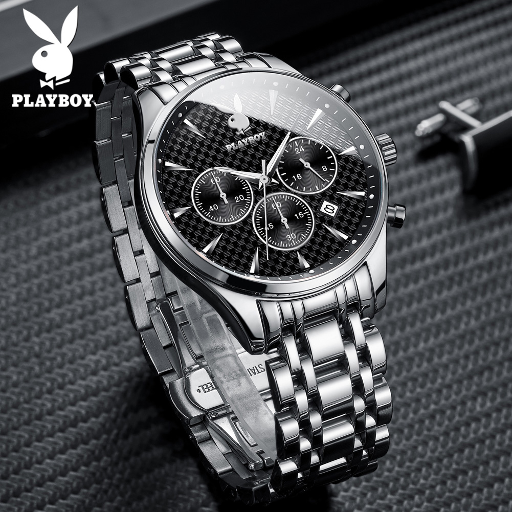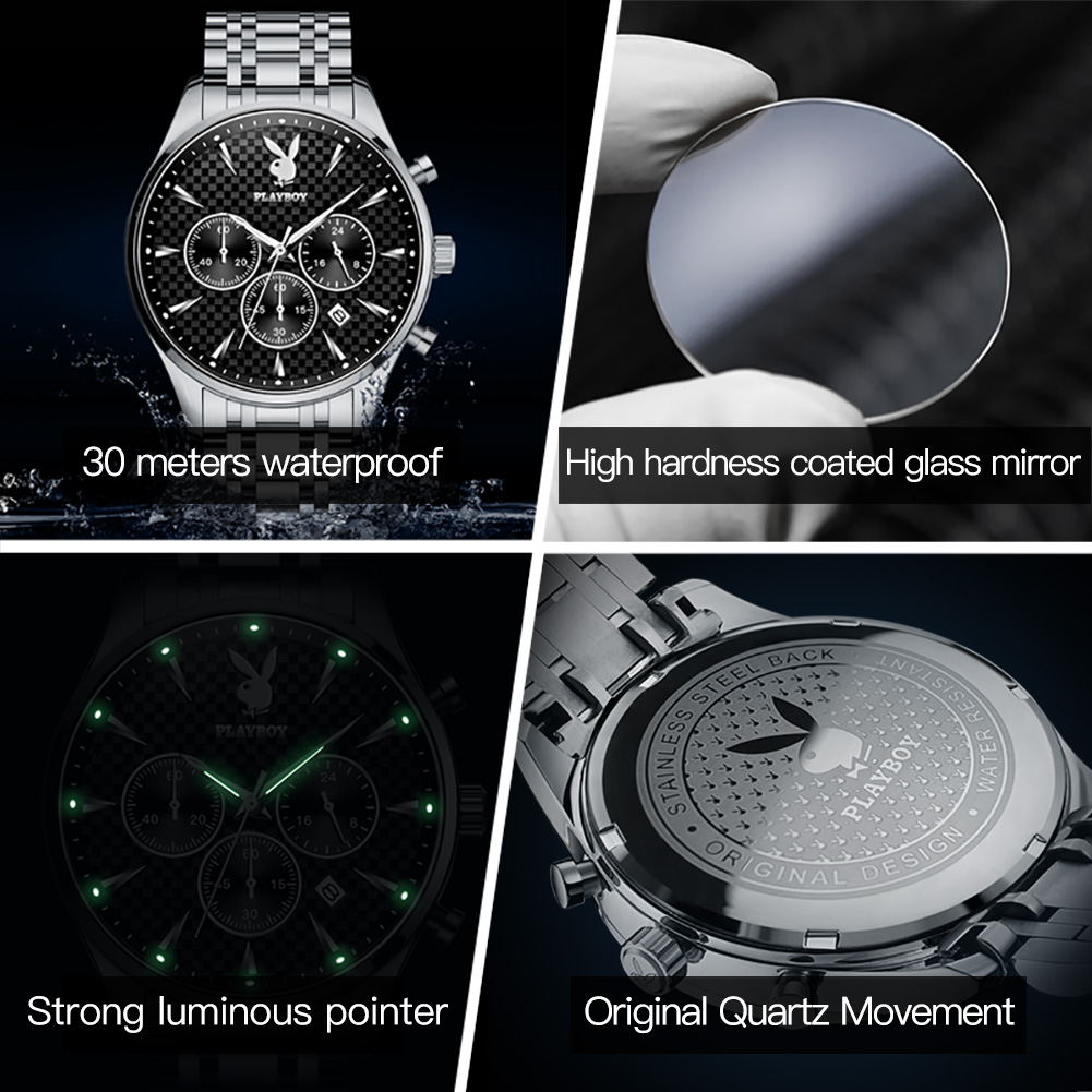 Top PLAYBOY Business Watch for Men Original 2022 Waterproof Luxury Stainless Steel Multifunction Chronograph Quartz Wristwatch