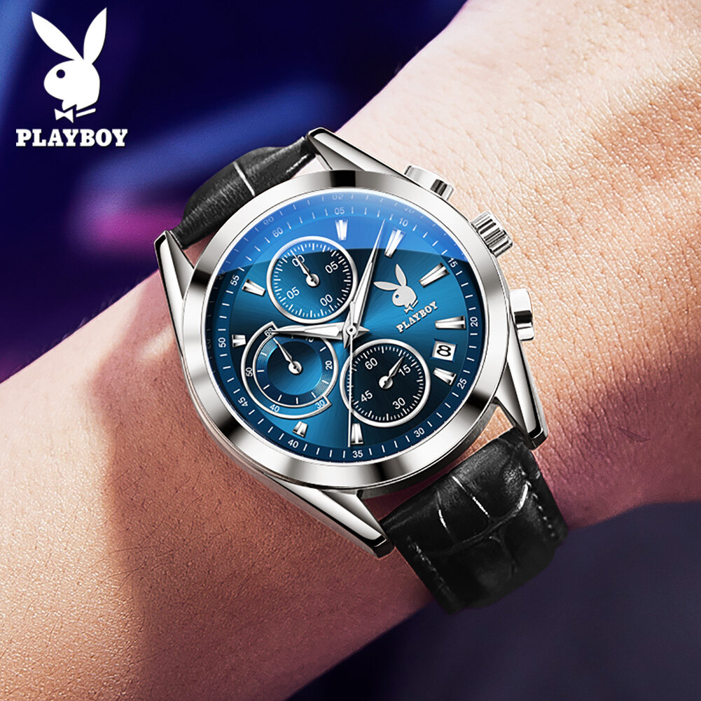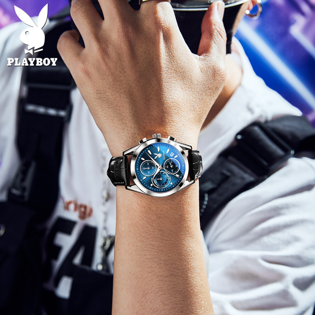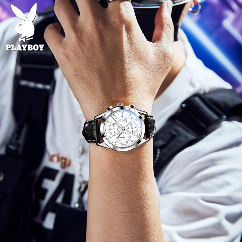 [Hot sale] PLAYBOY Watch For Men Original Waterproof 2022 Fashion Multifunction Dial Luxury Genuine Leather Strap Casual Mens Watch