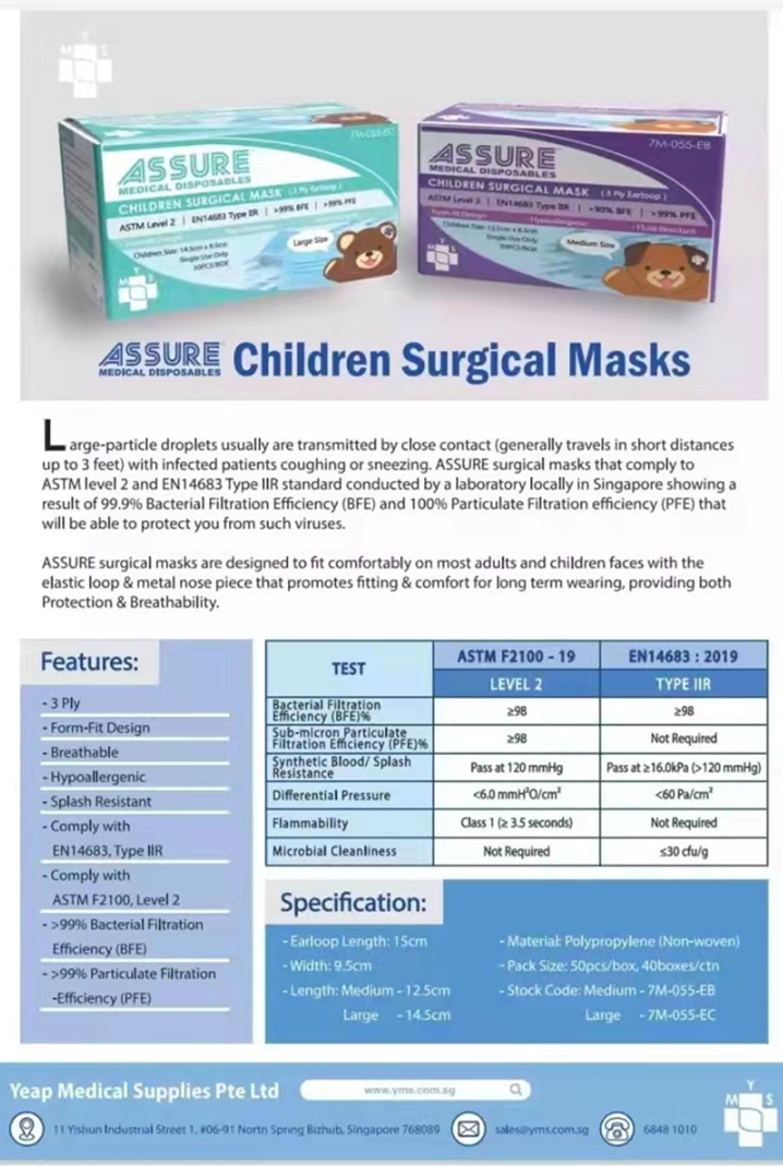 ASSURE Surgical Mask Kids Children 50’s/box 3-ply Earloop Disposable 99% BFE (6-12 years)