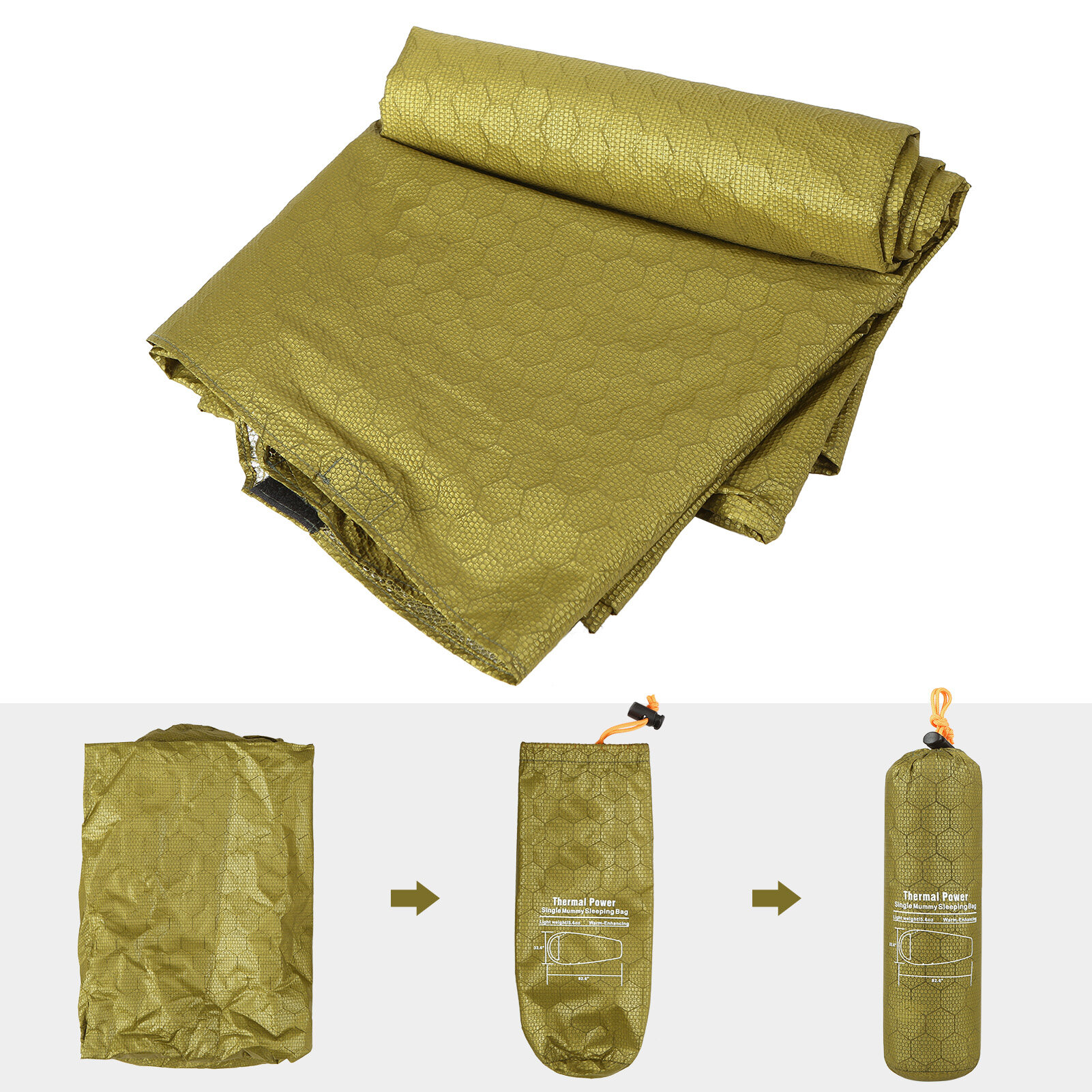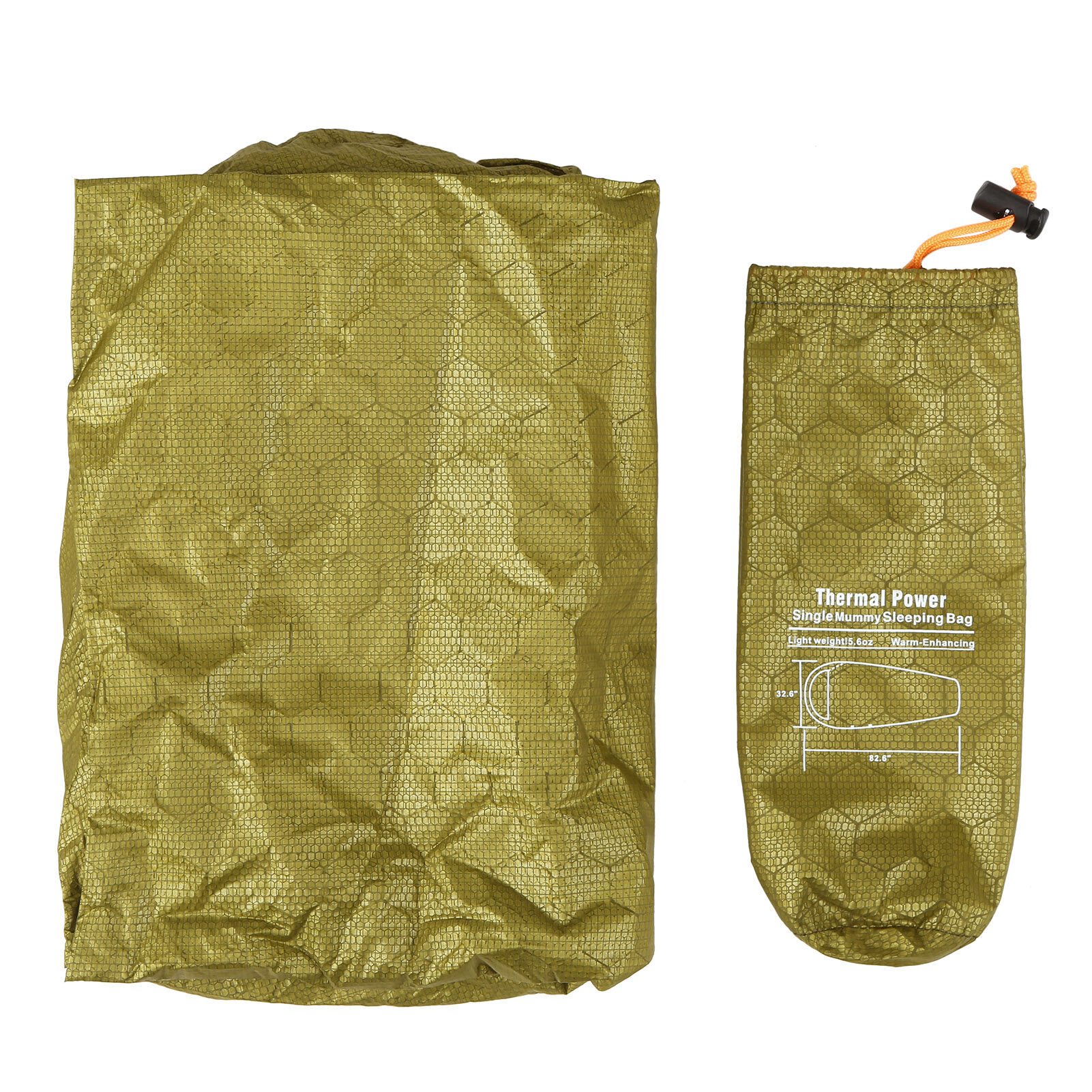 This emergency sleeping bag is made from water-resistant nylon shell fabric and heat-reflective aluminum inner coating to keep you warm in low temperature. It is lightweight and can be folded into a compact size for easy storage and carrying. It is perfect for camping, hiking, backpacking, outdoor adventure, survival, etc.