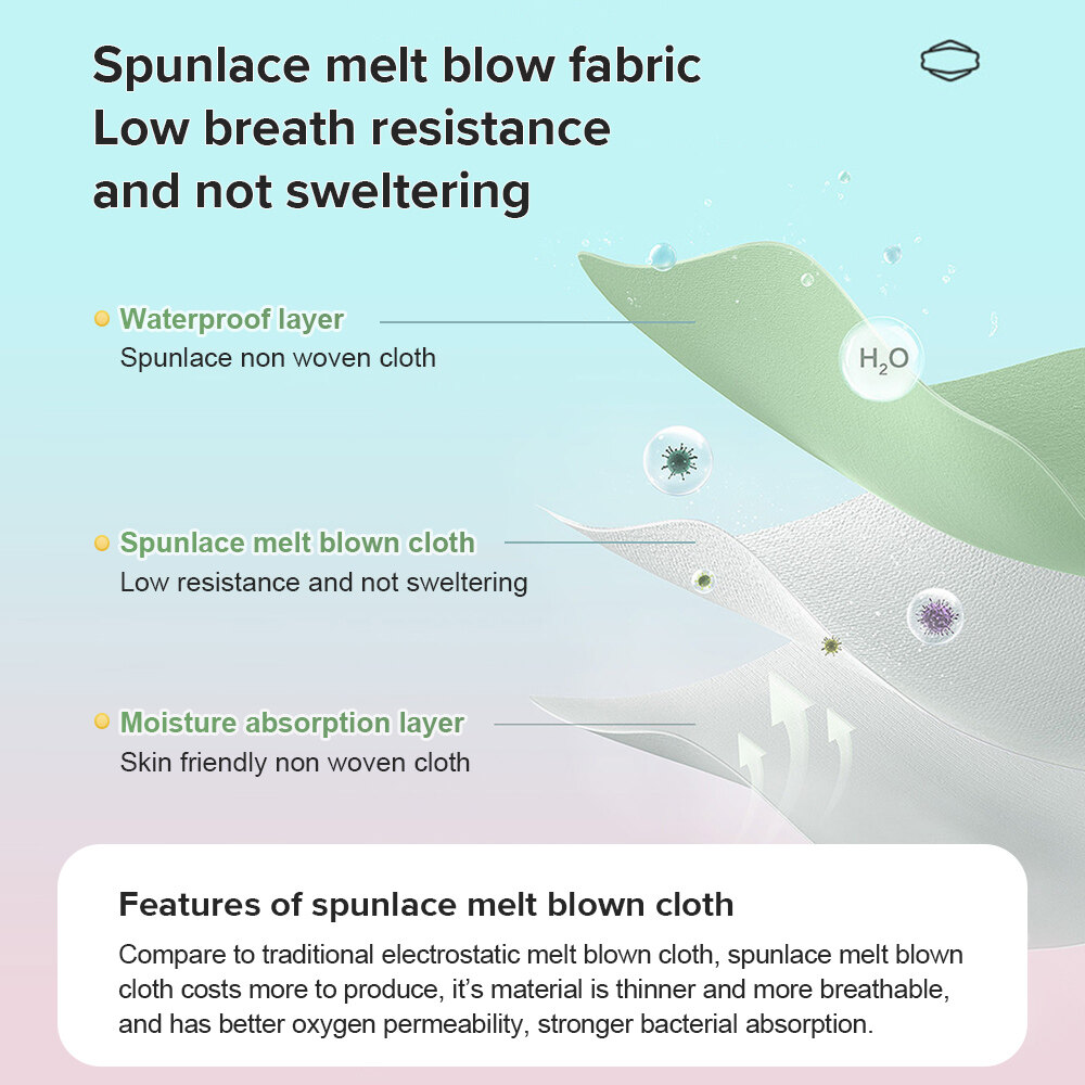 Structural composition: non woven fabric, melt down fabric, elastic band, polypropylene material
