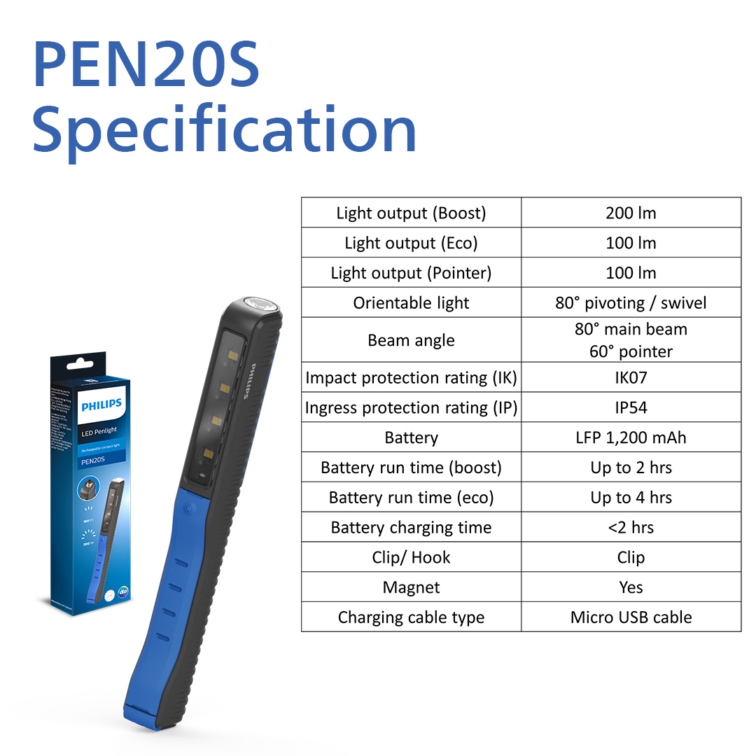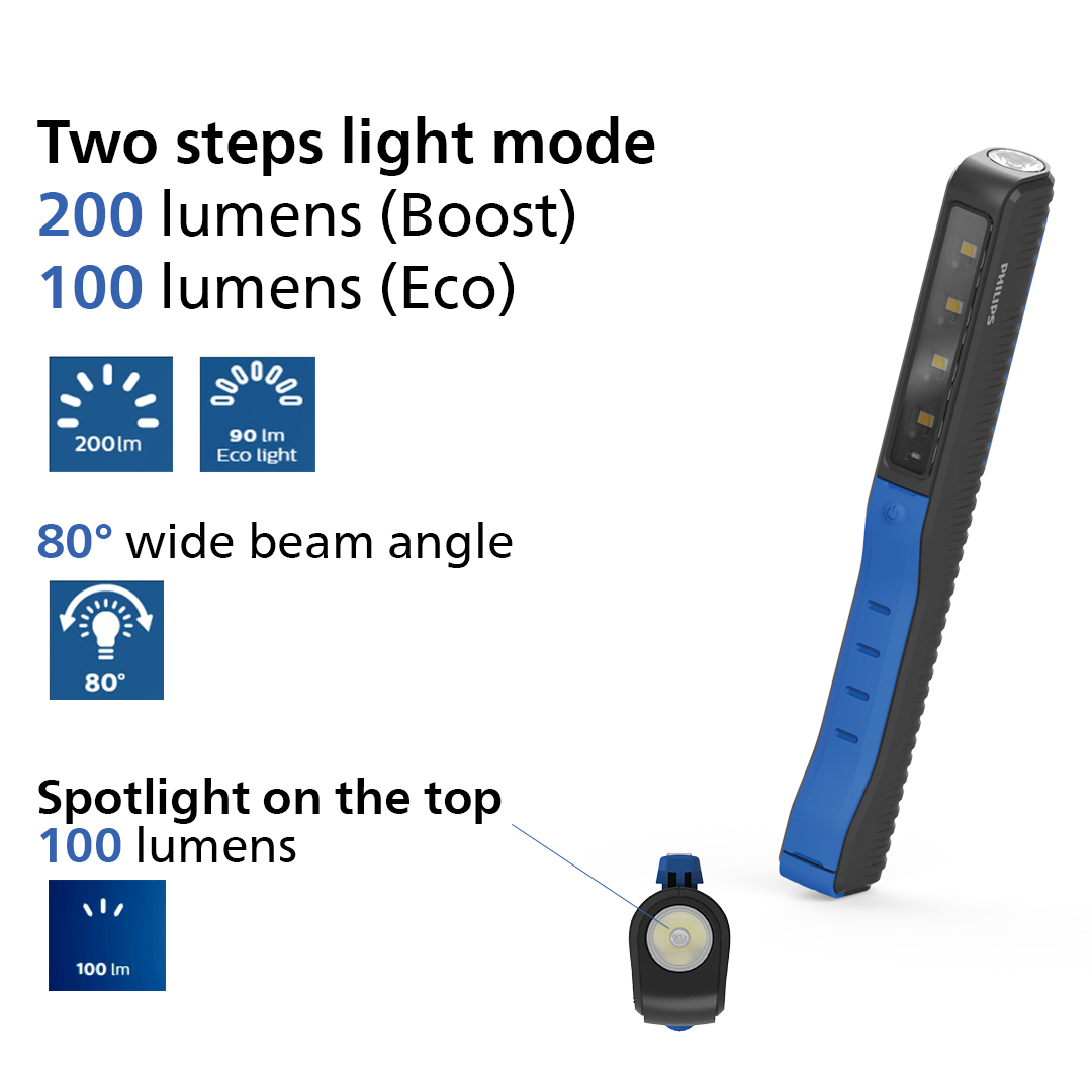 The Philips PEN20S is a compact penlight, ideal for quick inspection jobs. Its 4 high-quality LEDs provide a bright, natural white light of 6000 K, producing up to 200 lm, plus a 100 lm spotlight. Recharge via USB and use hands-free.