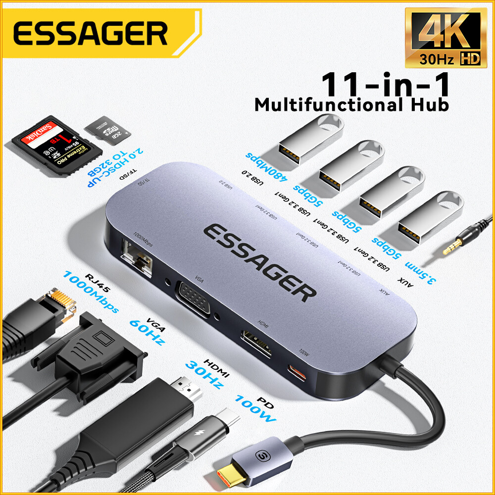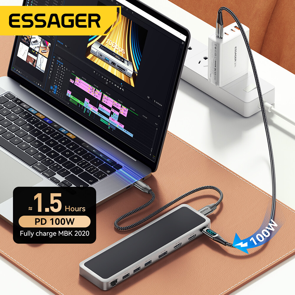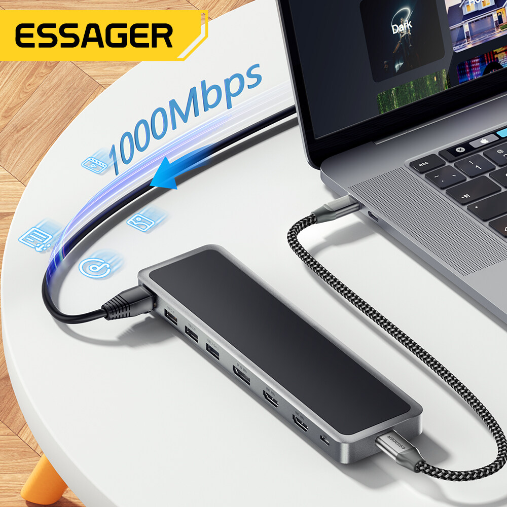 Essager USB C HUB Type C to HDMI-compatible USB 3.0 Adapter 11 in 1Type C HUB Dock RJ45 SD Reader PD 100W Charger For MacBook Pro Air USB C Splitter