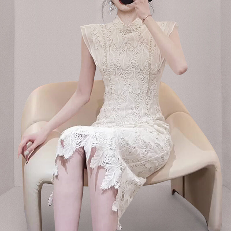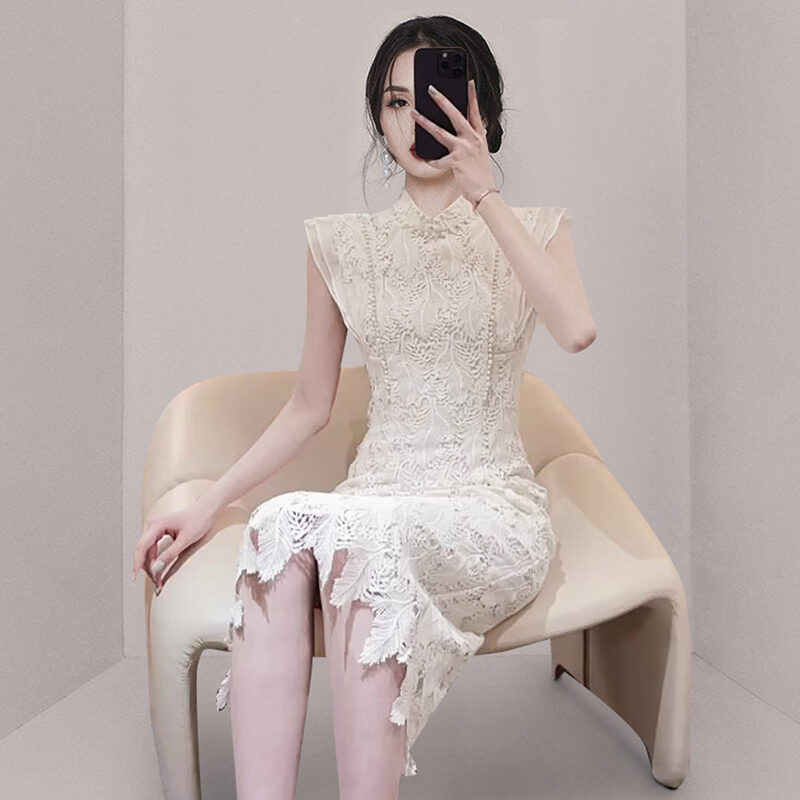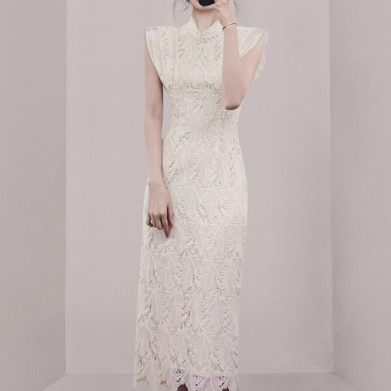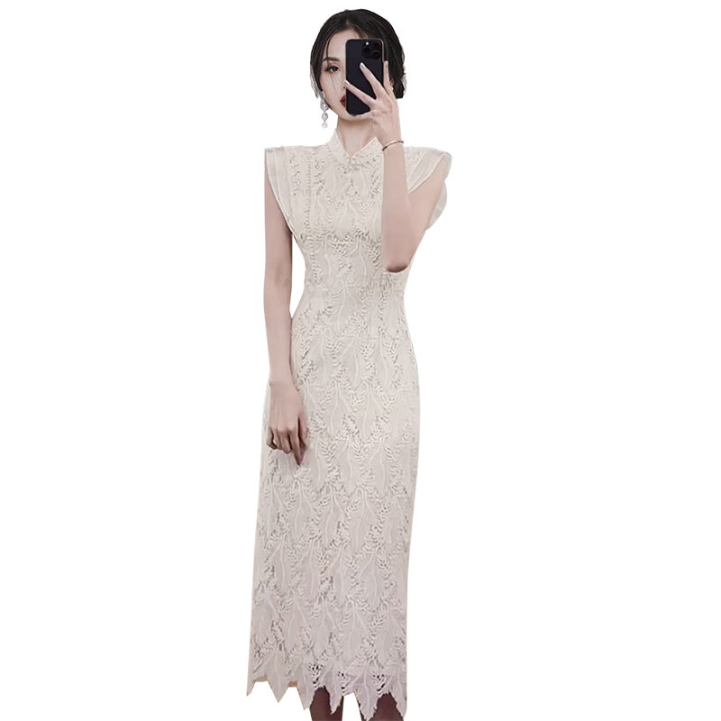 New Chinese Style Chinese Style Graceful Improved Cheongsam Waist Slim Looking off-the-Shoulder Gown Sleeveless White Lace Dress for Women
