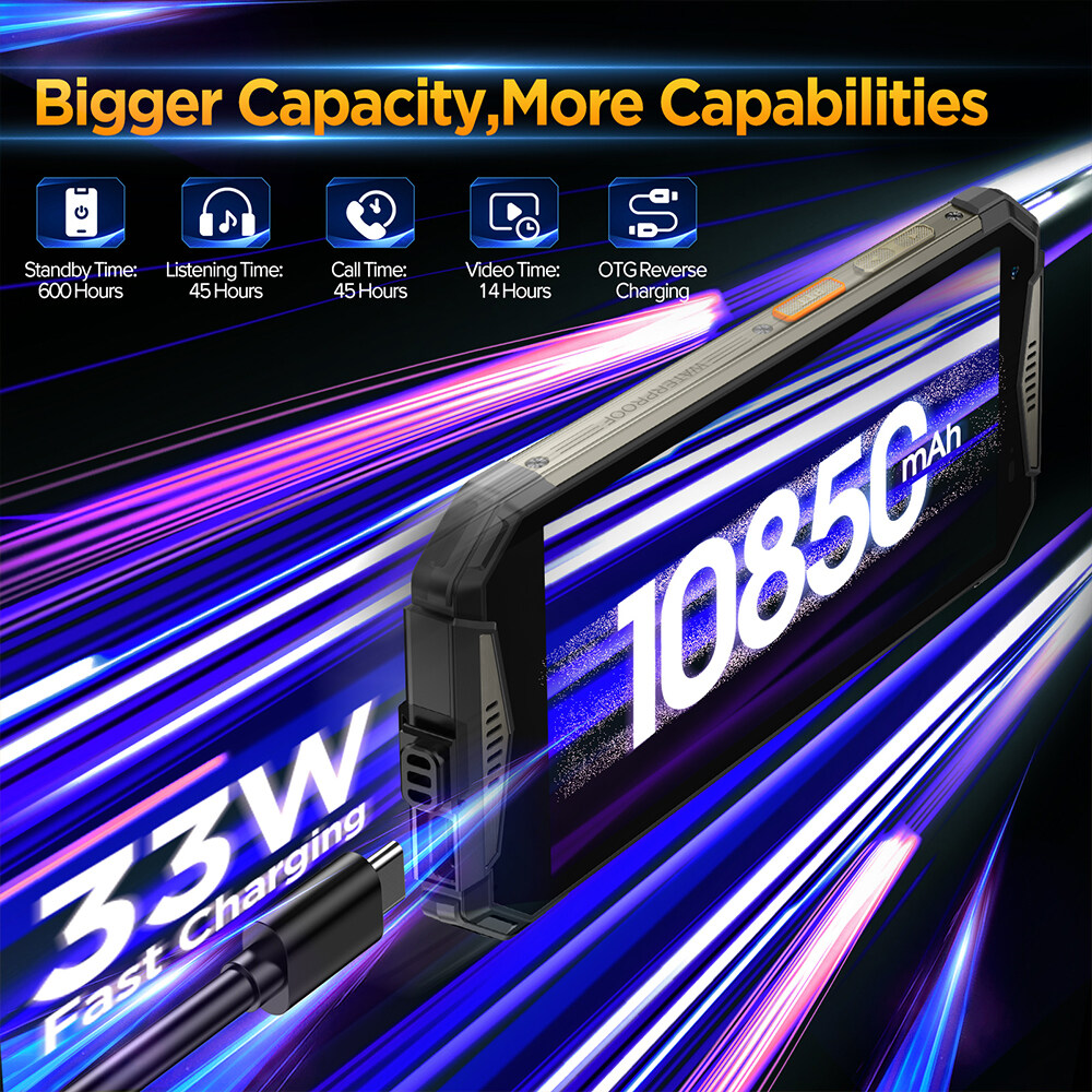 Zelfs met meer functies zoals DMR PTT, armor 20WT packs een krachtige 10850mAh batterij te afvoer voor meerdere dagen. Nooit zorgen over lage batterij maar dompel in uw tijd van muziek, films of games. 33W snel opladen maakt de batterij bar te houden voor 2 dagen door gewoon 10 minuten opladen. OTG reverse opladen kan je een noodhulp.
