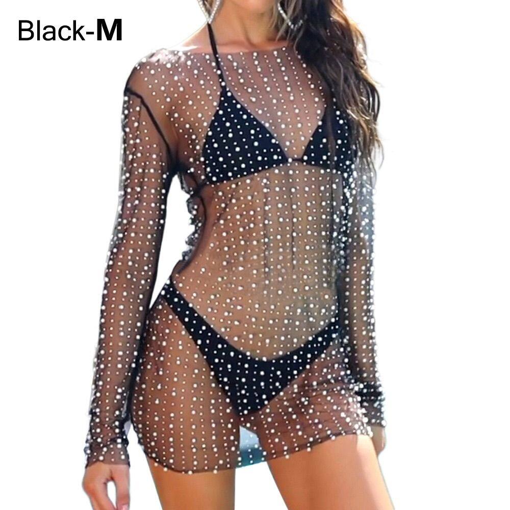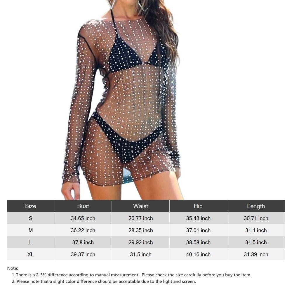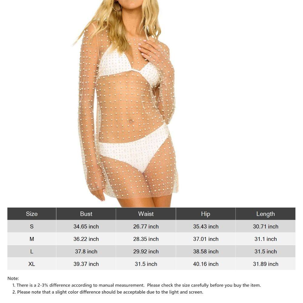 GLASSES VIEW Beachwear Pearl Rhinestone Long Sleeve Round Neck Mini Dress Bathing Suit Coverups Bikini Cover Ups Women's Cover Up Dress