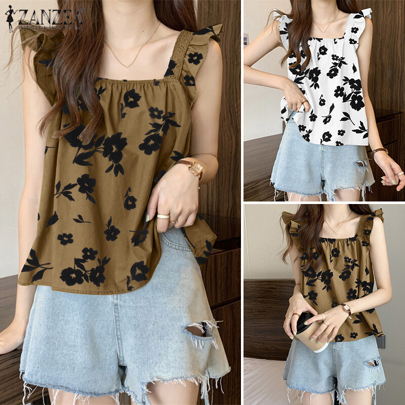 MOMONACO ZANZEA Korean Style Women's Camisoles Casual Square Neck Flower Printed Ruffles Sleeveless Tank #10