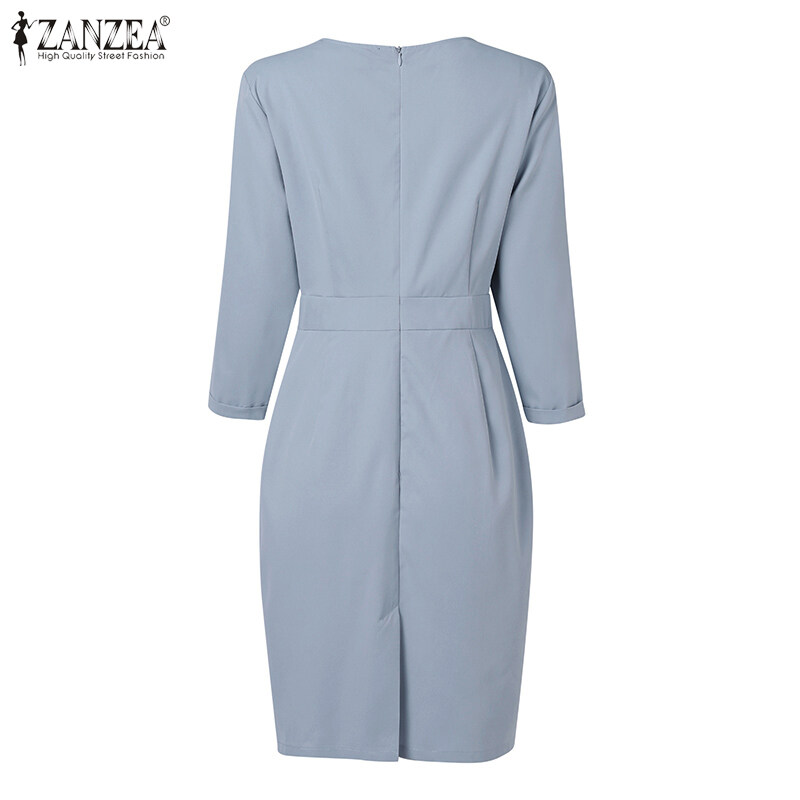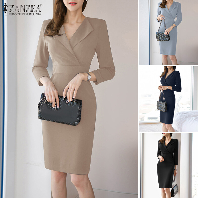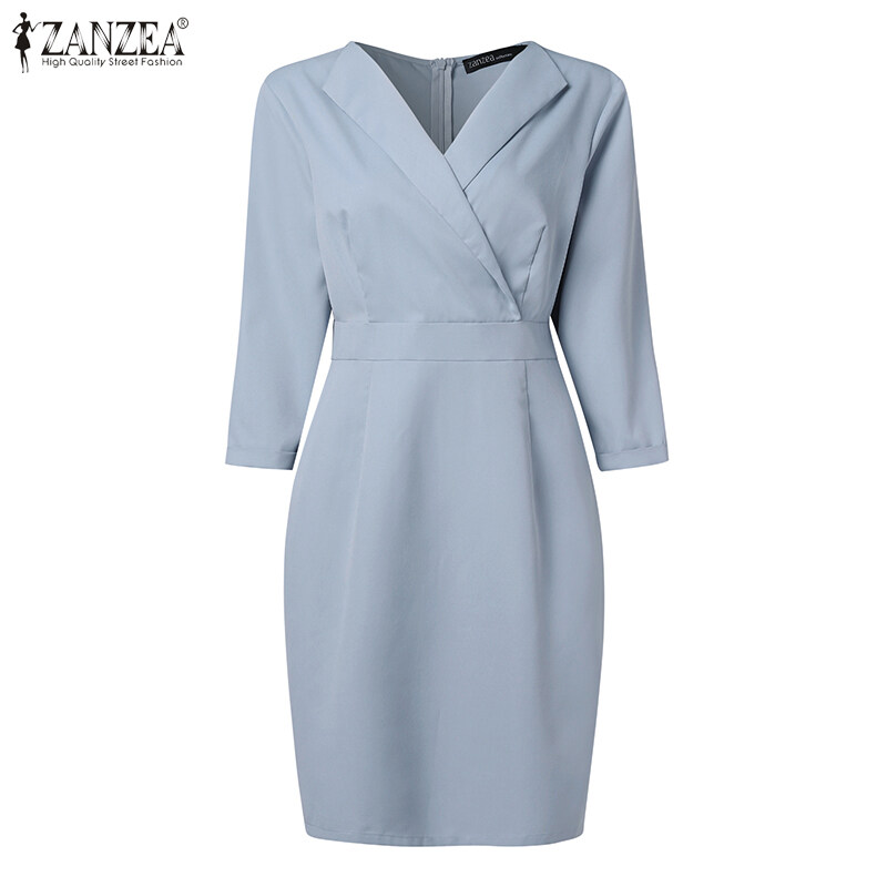 MOMONACO ZANZEA Korean Style Women's Dresses Formal Office V-Neck Solid Dress Lapel 3/4 Sleeve Bodycorn Dress #11