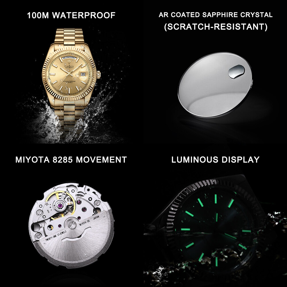 CADISEN Original DD40 Japan MIYOTA 8285 Men Watch Ice Blue Automatic Luxury Gold Stainless Steel Mechanical Waterproof AR Sapphire Glass C8215