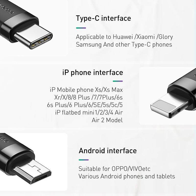 Baseus 3 in 1 USB Cable For iPhone 12 11 Fast Charging USB Type C Cable For Samsung S20 S10 Xiaomi Huawei Vivo Micro USB Data Cable