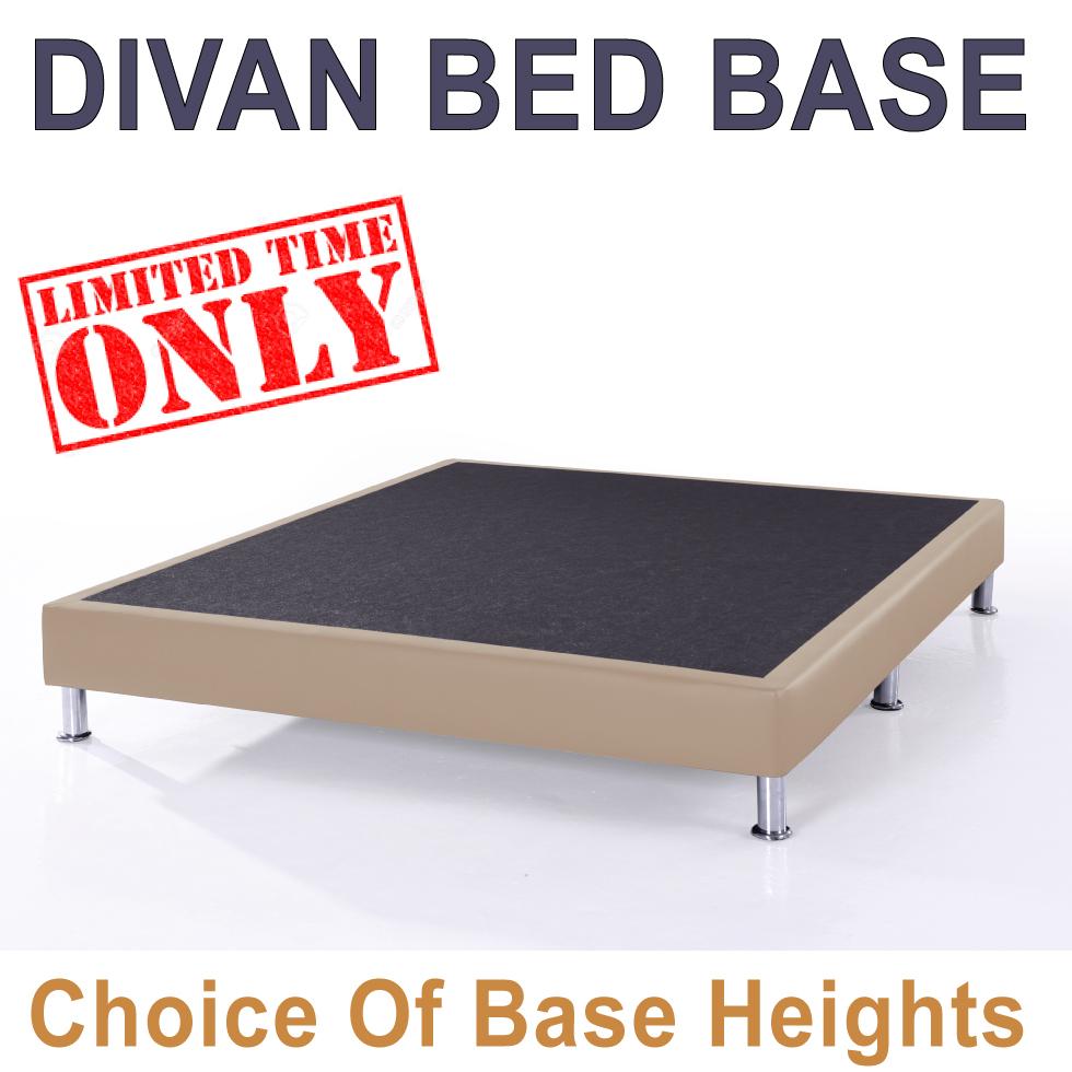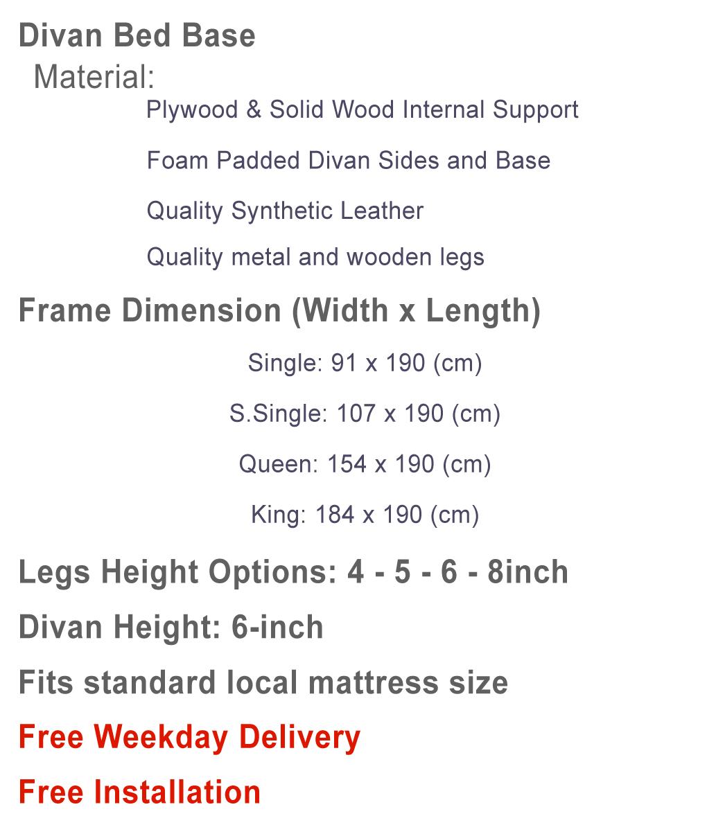Queen size Divan Bed Base Lenght 191 cm x Width 154 cm Upholstered in Synthetic Leather Light sandstone color Plywood & Solid wood internal support Foam Padded Divan sides and base 5 inches height Metal Legs Total Divan Base height: 11 inches Simple & Smart choice for any bedroom