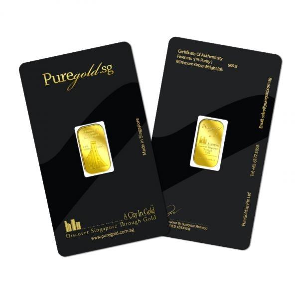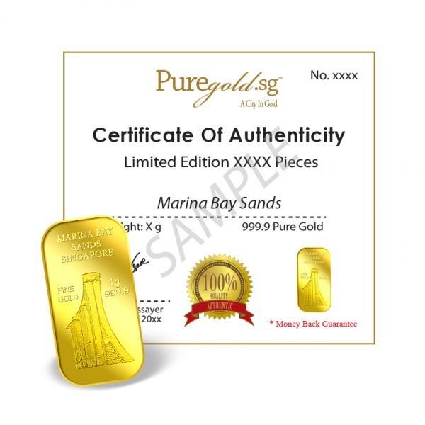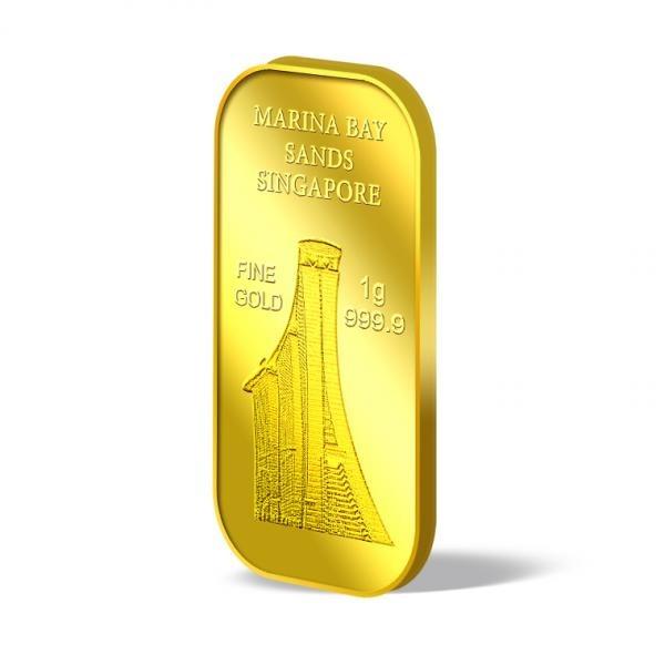 The image of Marina Bay Sands is embossed on a 1g 999.9 fine gold bar.