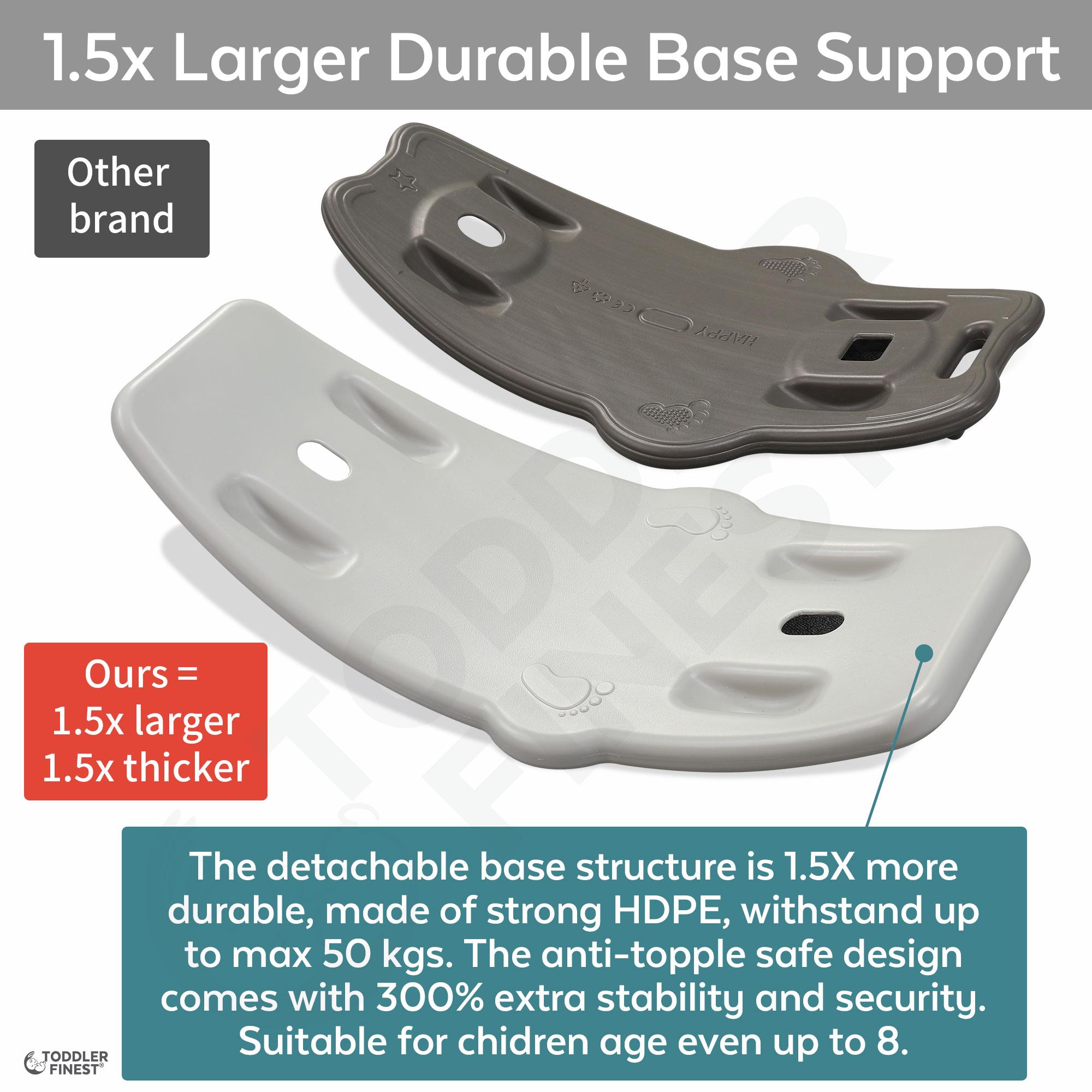 ❤️1.5X THICKER & LARGER, ERGONOMIC: Compared to other brands, our rocking horse comes with 2-sided enlarged surrounded wing design, for 1.5x better back support and spine protection. The safety seat is designed in 1.5X elongated U-shape, with built-in safety belt for good sitting posture development. The anti-slip / anti-overturn smart mechanism automatically balance swing force to ensure safety while riding. Product size: 77*88*51 cm. Weight: 4 kgs.